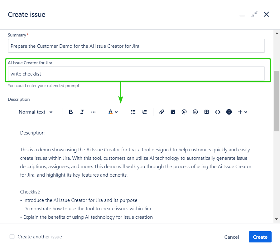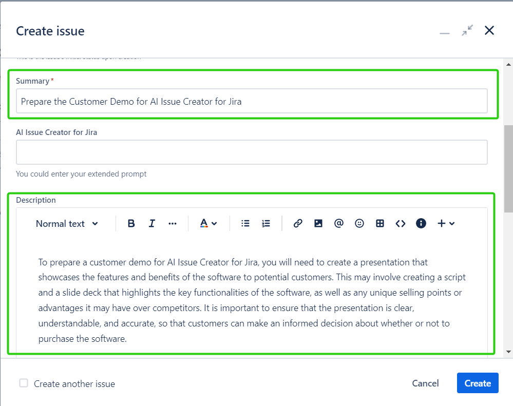 This feature proves useful when you have opted for the 'Manual generation' mode during the app setting or desire to utilize a more precise prompt. The 'AI Issue Creator for Jira' field enables you to input additional prompts that can help generate a more tailored description for your issue.