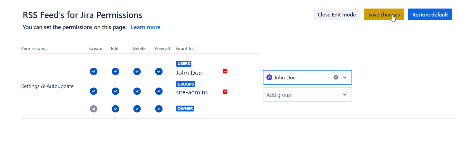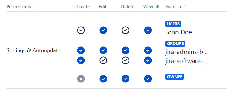 John Doe is a member of a jira-software-users group, but he has his own permissions granted: he is not able to create Subscriptions and Schedulers, but can edit every Subscriptions and Scheduler that is created. He is able to delete only the Subscriptions and Schedulers he is the owner of.