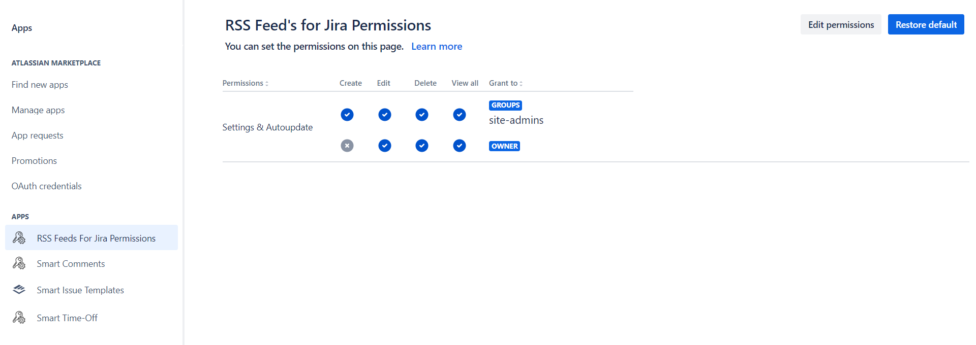 The Permissions page allows configuring permissions for various actions that users can perform with the app.