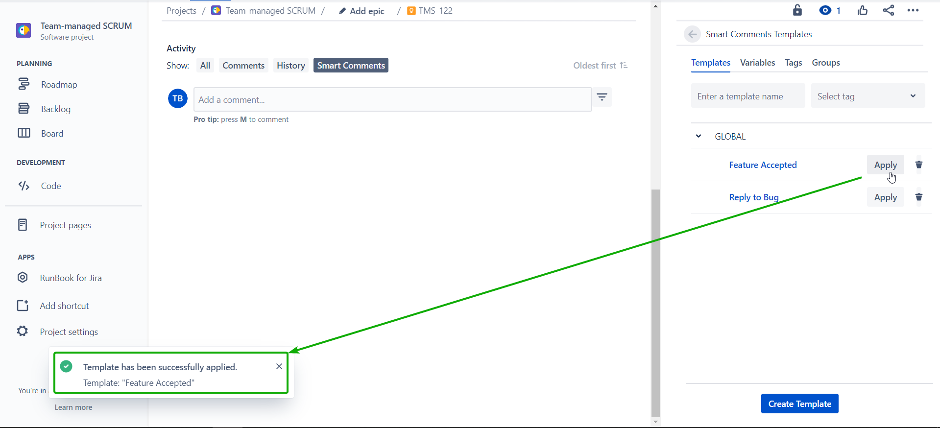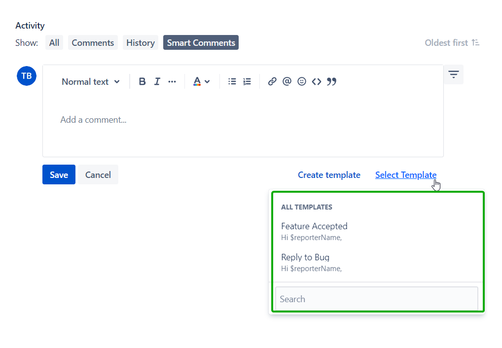 Once the Comment Templates are created they can be applied in the Jira Comments section. There are two ways to apply saved Comments in general: from the Smart Comments tab in the issue Actions and directly from the Templates tab of a Smart Comments Templates panel.