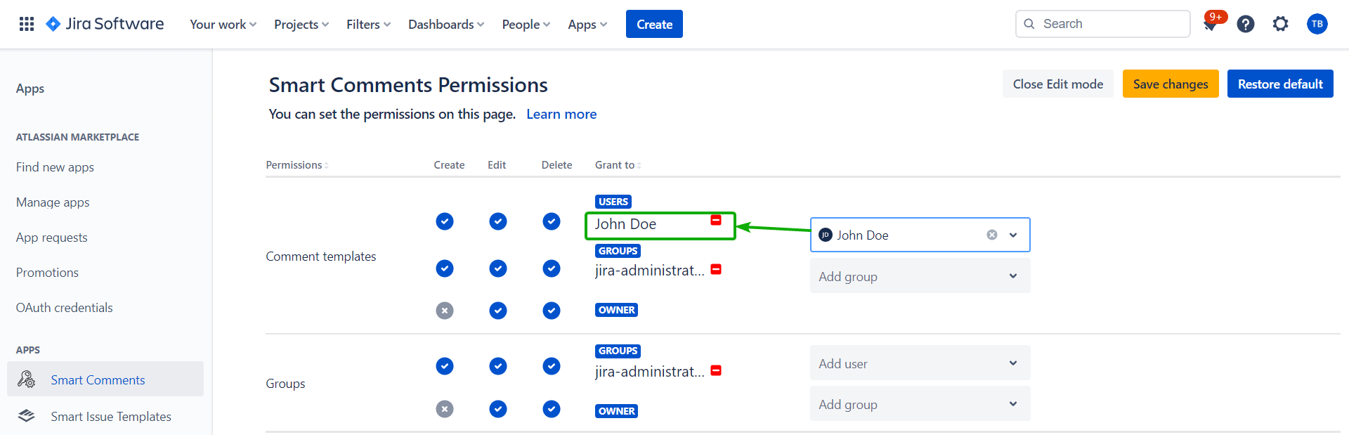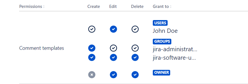 Members of the jira-software-users group (except John Doe) can create templates, but ‘Edit’, and ‘Delete’, actions are available only for templates every user of this group is the owner of.
