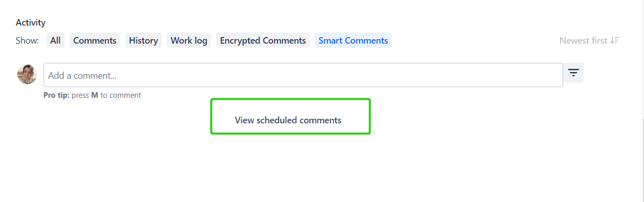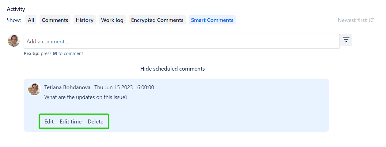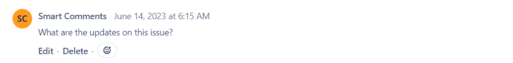 Once a scheduled comment is posted, it appears as authored by 'Smart Comments' in the native Jira comments. However, the original author's name is displayed within the' Smart Comments' tab.