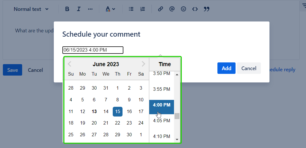 Compose your comment in the 'Add a comment' field, then select 'Schedule Reply'.