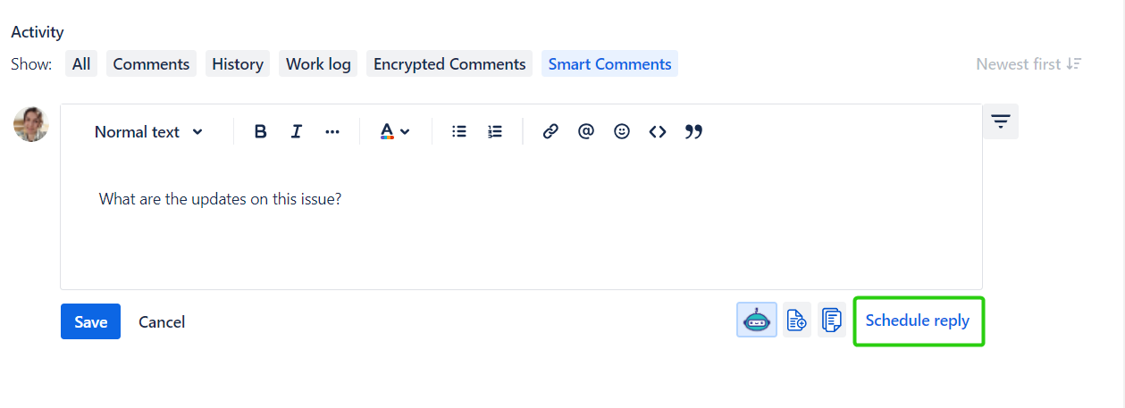 The Scheduled Comments feature in the Smart Comments app is a user-friendly tool that simplifies your workflow in Jira. Anyone can write and schedule comments for automatic posting later with a few clicks. This handy feature ensures prompt responses and improved project management, making scheduling reminders or planning future discussions effortlessly. Automating communication enhances efficiency and keeps your team on track.