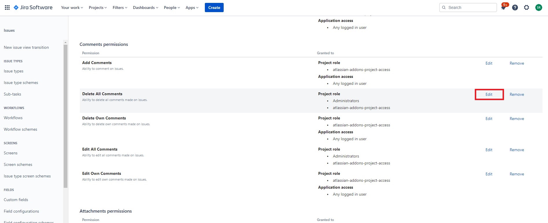 Project Name or Default Permission Scheme → Actions: Permissions