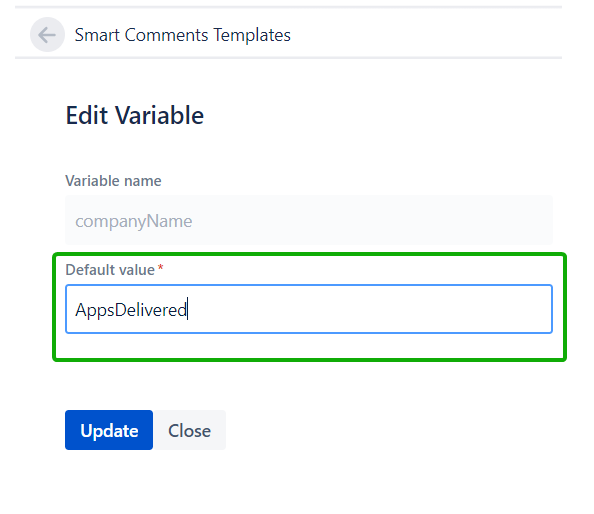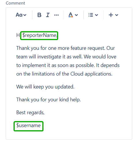 To start using Variables we have to add them in the Comment field when Creating or Updating or Comment Template. To do that we simply need to write a dollar sign - $ followed by the name of the variable we want to use. It is important to use the $ otherwise, the add-on will not understand what you are trying to achieve.