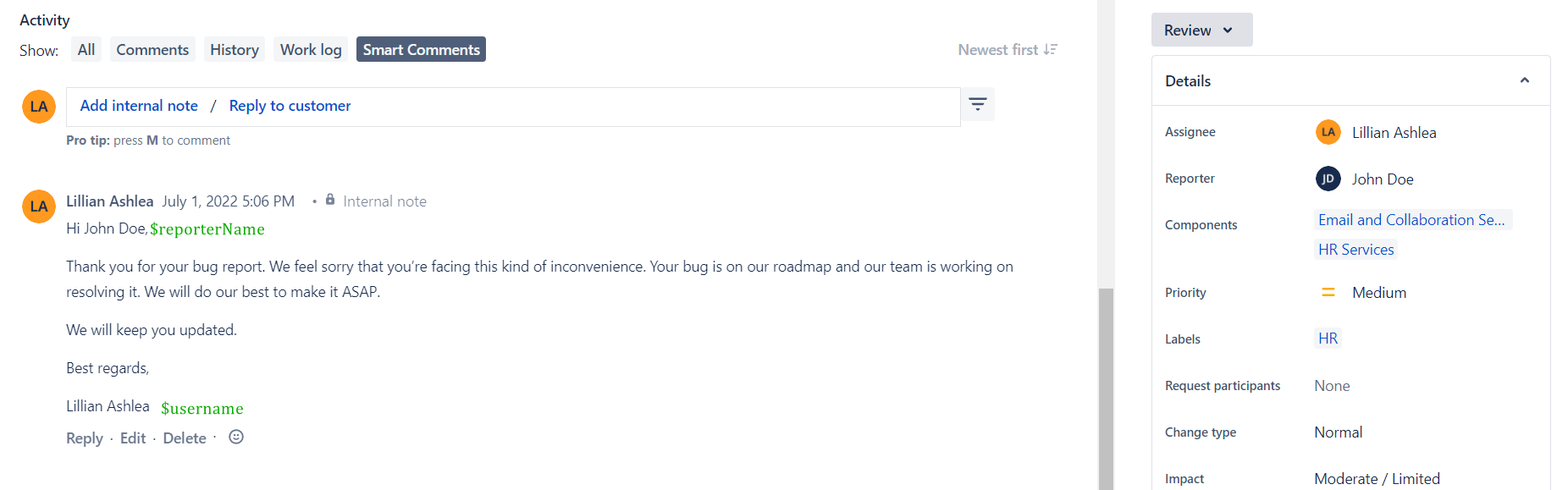 If Variables were added correctly, they will be filled in automatically after the Comment Template is applied.