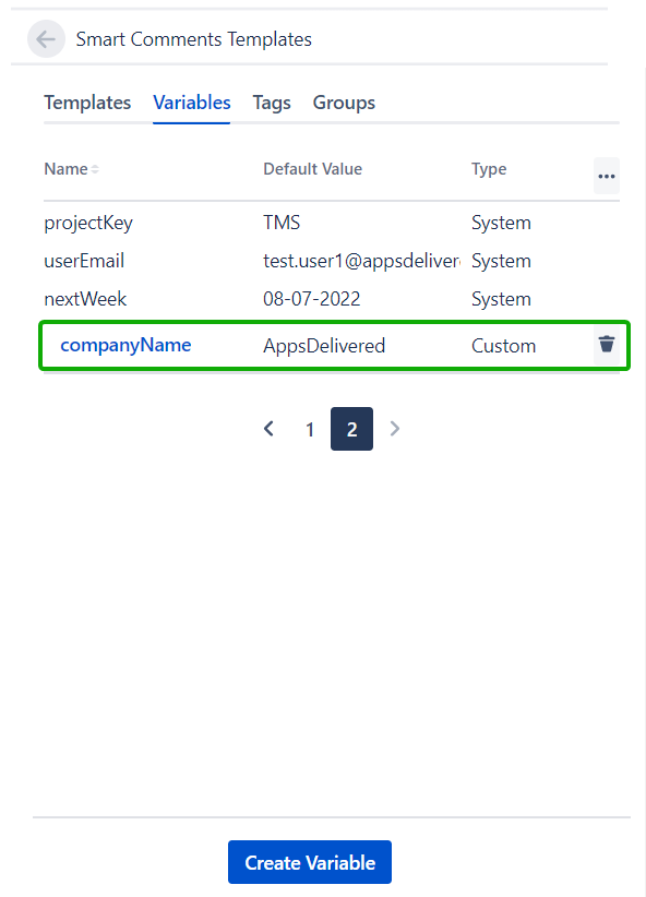 All created Custom Variables will be shown after the System Variables in the Variables list