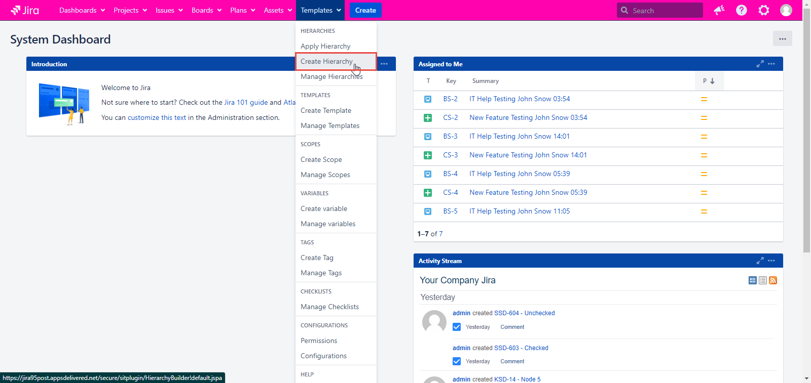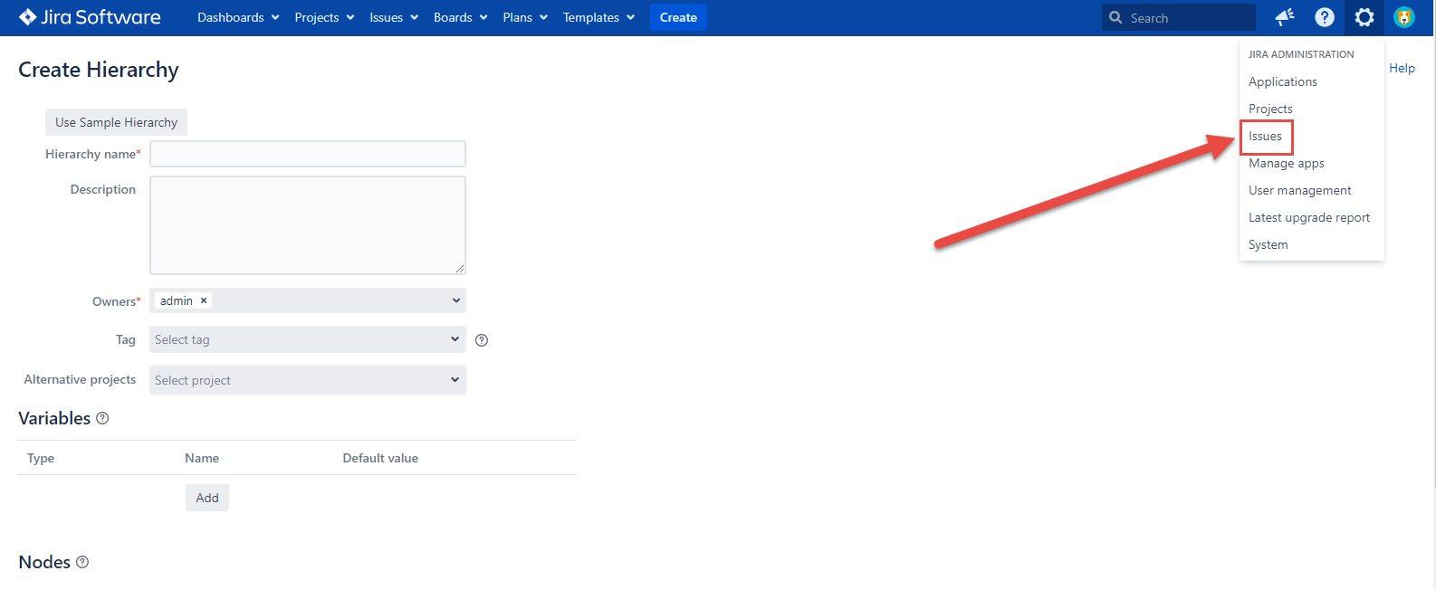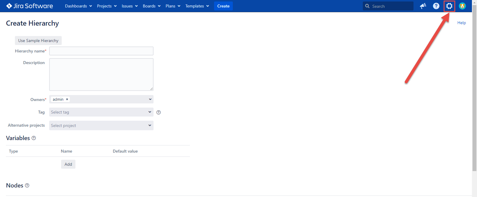 If you want to implement this feature in the new Hierarchy, the first thing you have to do is to create one. Click the Templates button in your Jira instance and select the Create Hierarchy item.