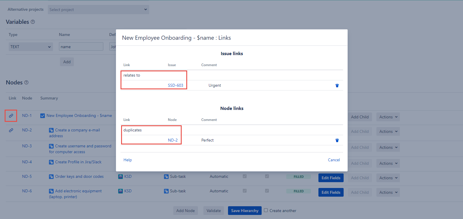 After opening the dialog we can see that the first Node relates to the SSD-603 and that it duplicates the ND-2 node. In the Comment column there are two comments as Urgent and Perfect.