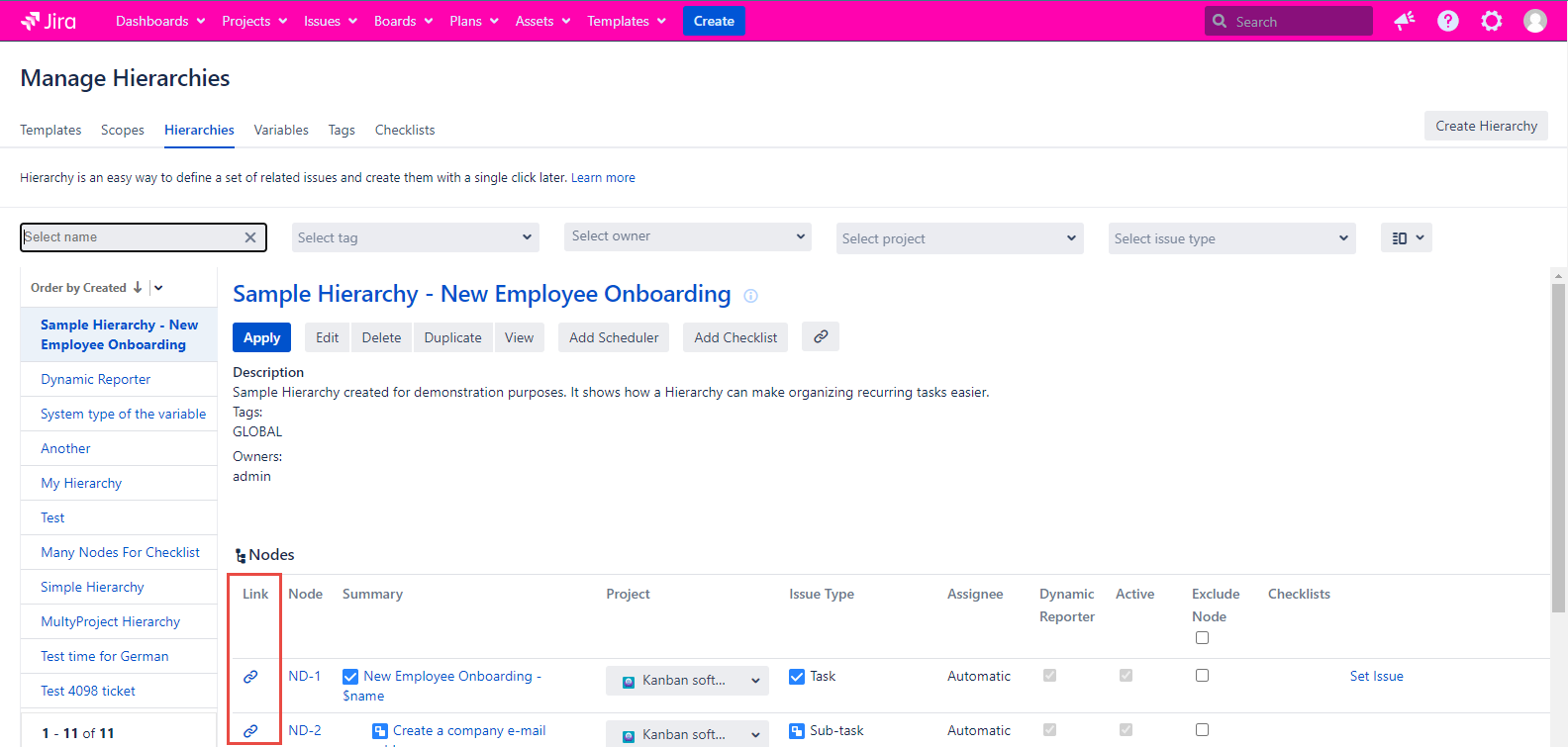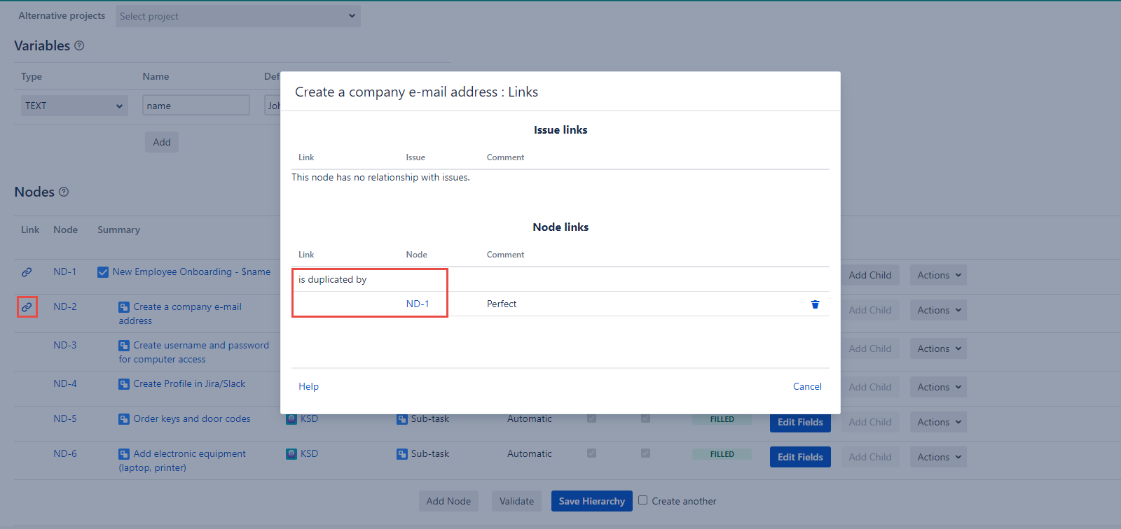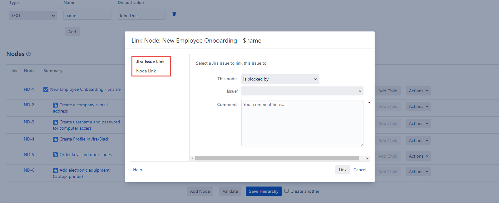 When the Link button is clicked, you will get the Link Node dialog. First thing you have to do, is to decide whether you want the chosen Node to be linked to the already existing issue or to the issue that will be created after this newly created Hierarchy, is applied.