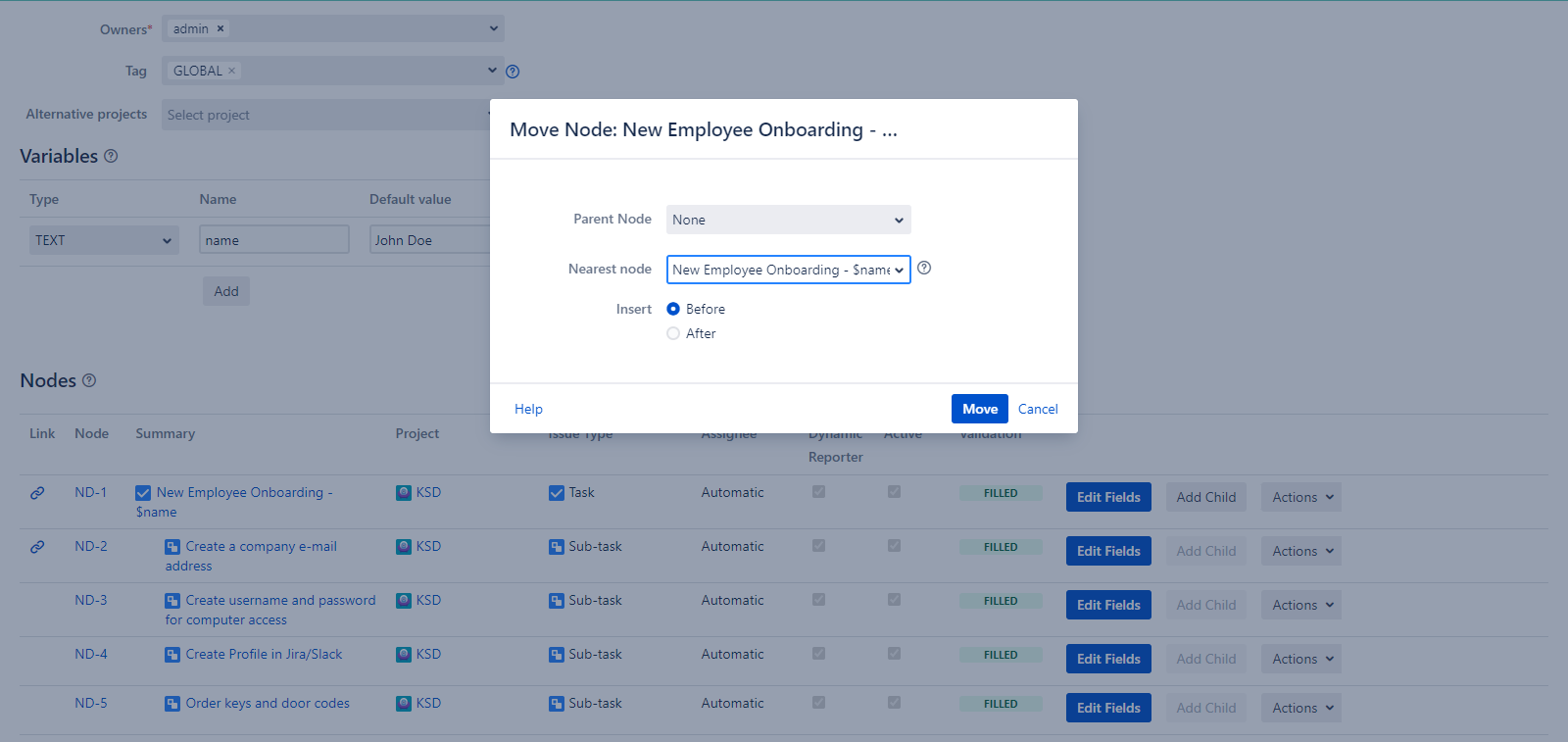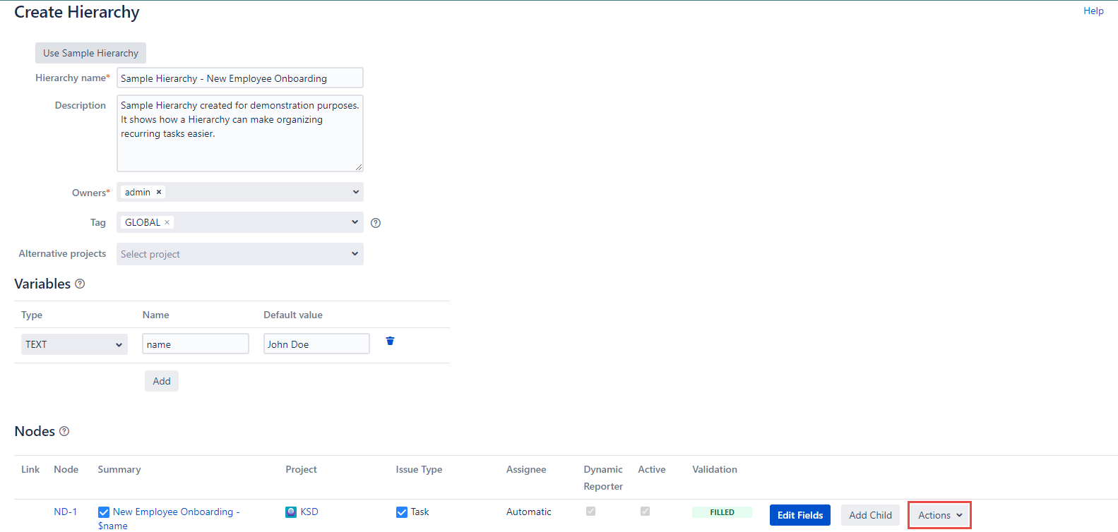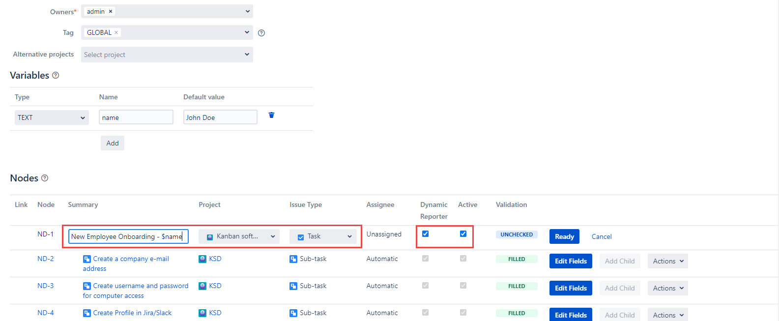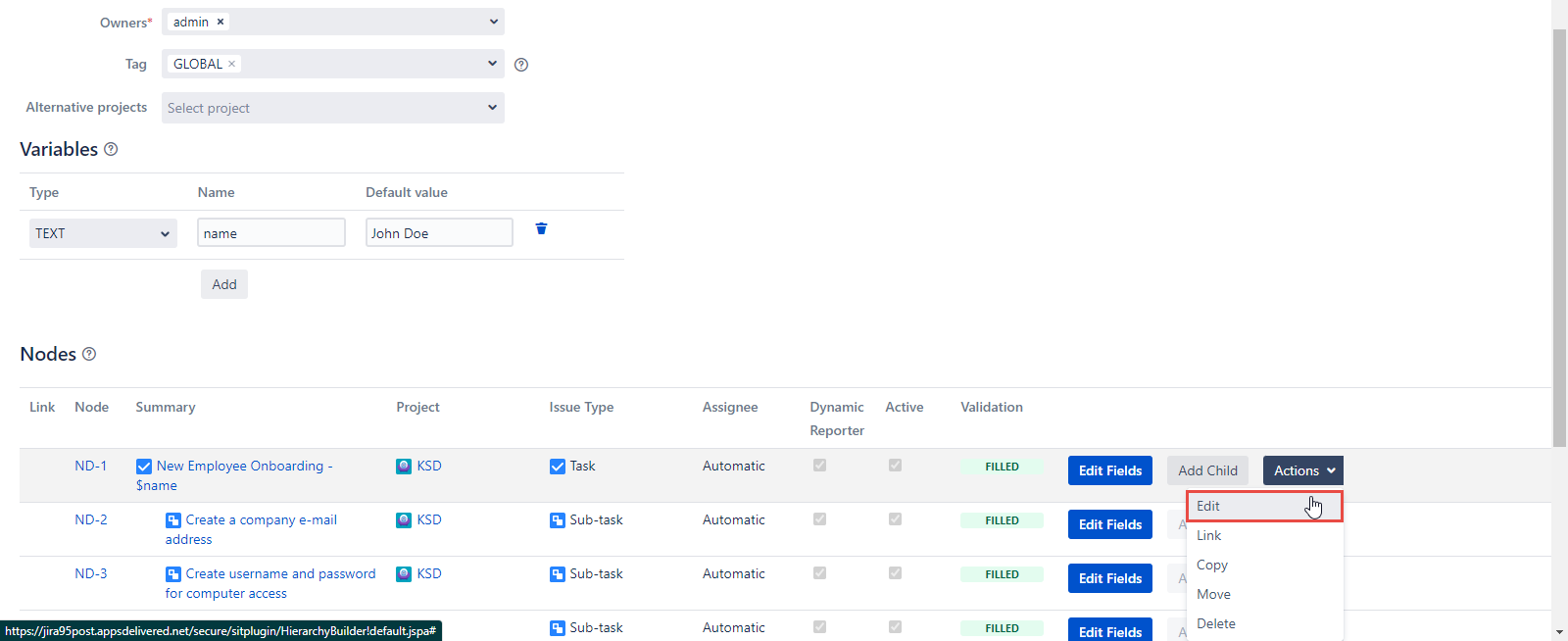 Click the Edit button in the Actions dropdown and you will be able to edit the Node’s Summary, Project, Issue Type, Dynamic Reporter, and Active fields of the current Node.
