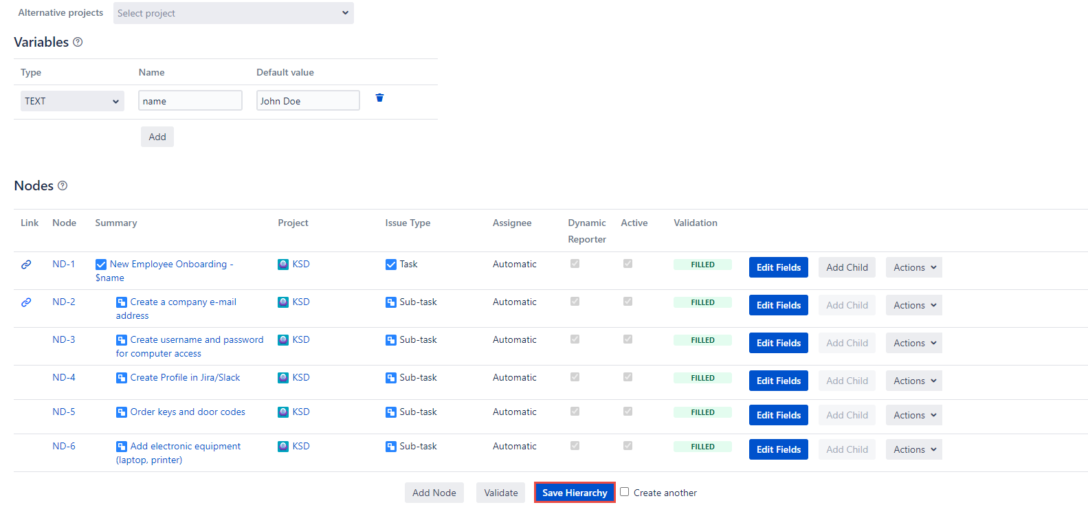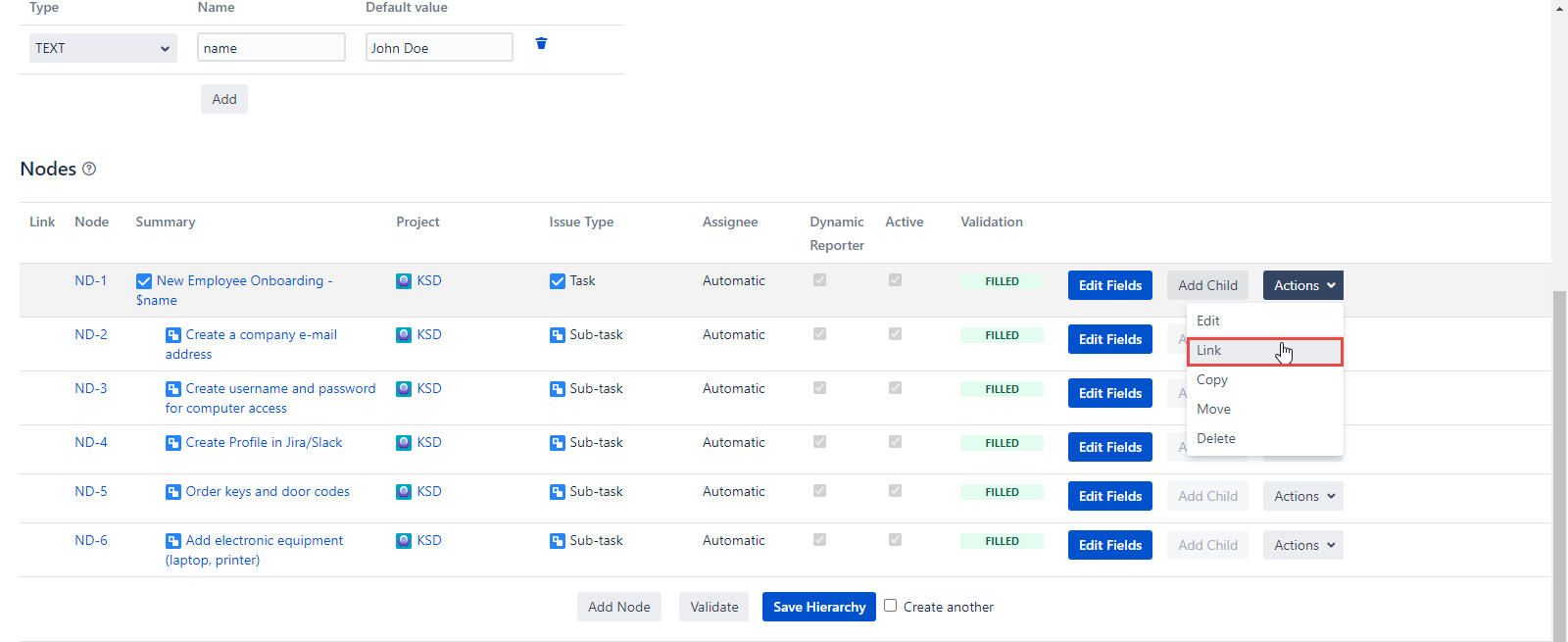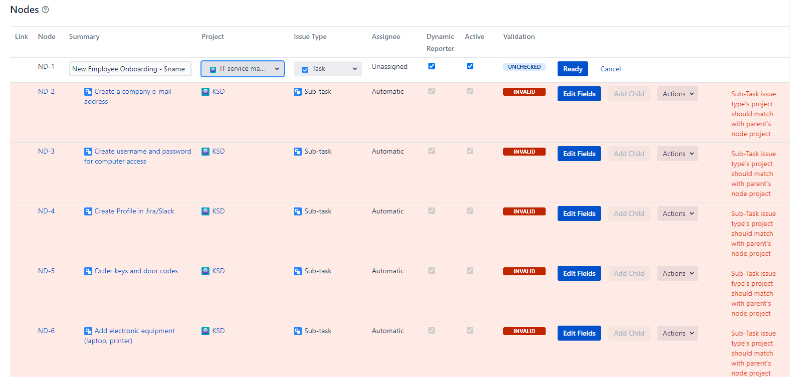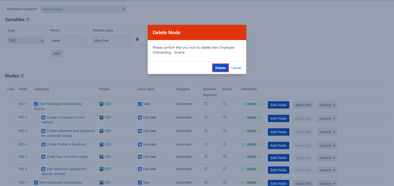 Click the Edit button in the Actions dropdown and you will be able to edit the Node’s Summary, Project, Issue Type, Dynamic Reporter, and Active fields of the current Node.