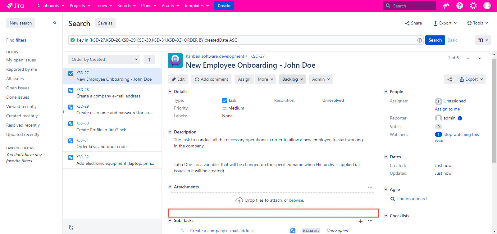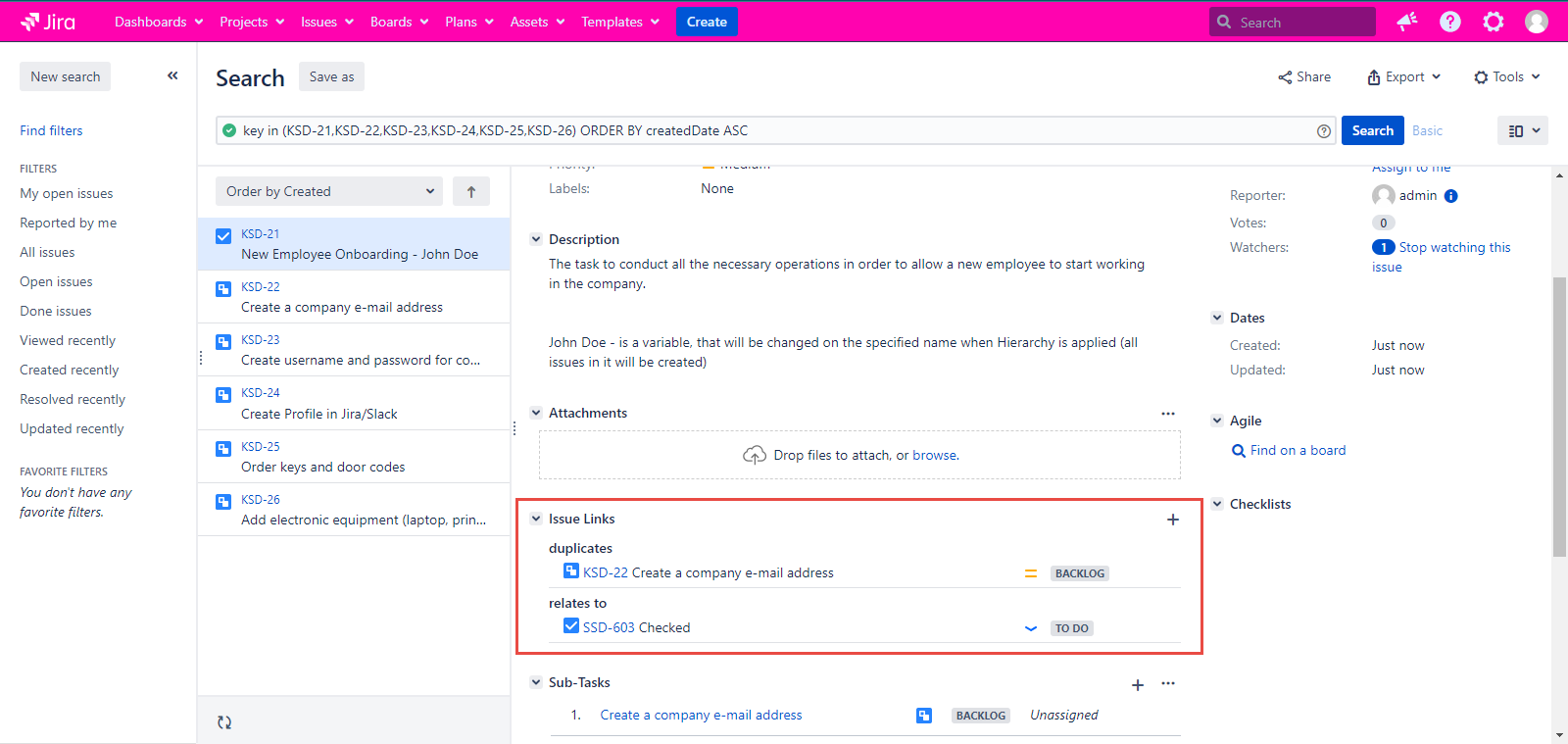Jira by itself provides an ability to link issues with each other. If you are not familiar with this feature, it is very helpful when one has a task to perform and this task is closely related to a task of another team member. In this case, linking one issue to another would be the best practice. Also, you can now do the same thing in Smart Issue Templates with the help of Hierarchies.