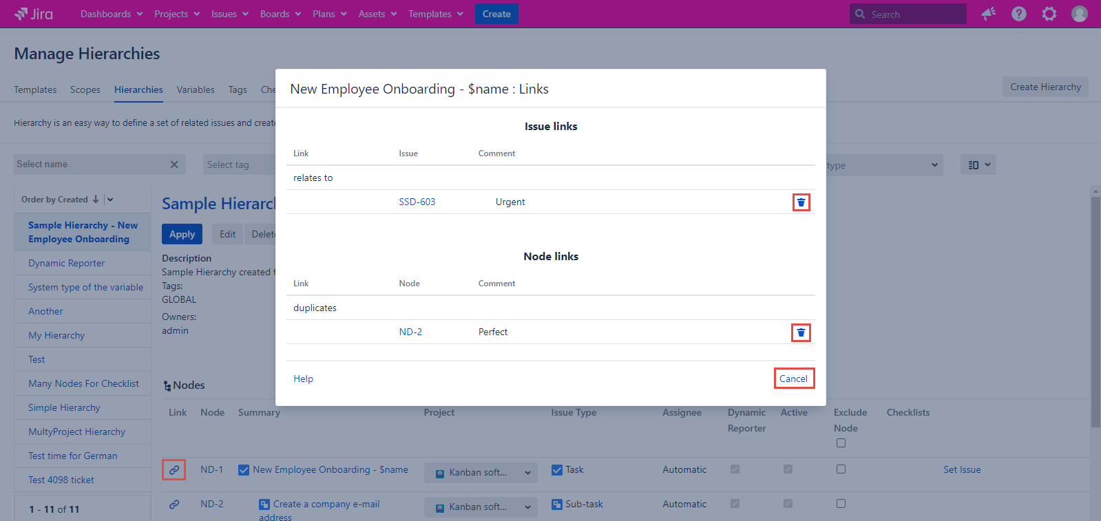 In case you have already created a Hierarchy with all links you need and you want to apply this Hierarchy without any links, you have to delete a link and apply the Hierarchy. You’ll get all the Jira Issues created but without the extra links. The best part is that all the implemented changes (deleted links) will not be saved and next time you open up the current Hierarchy you will still have your links attached.