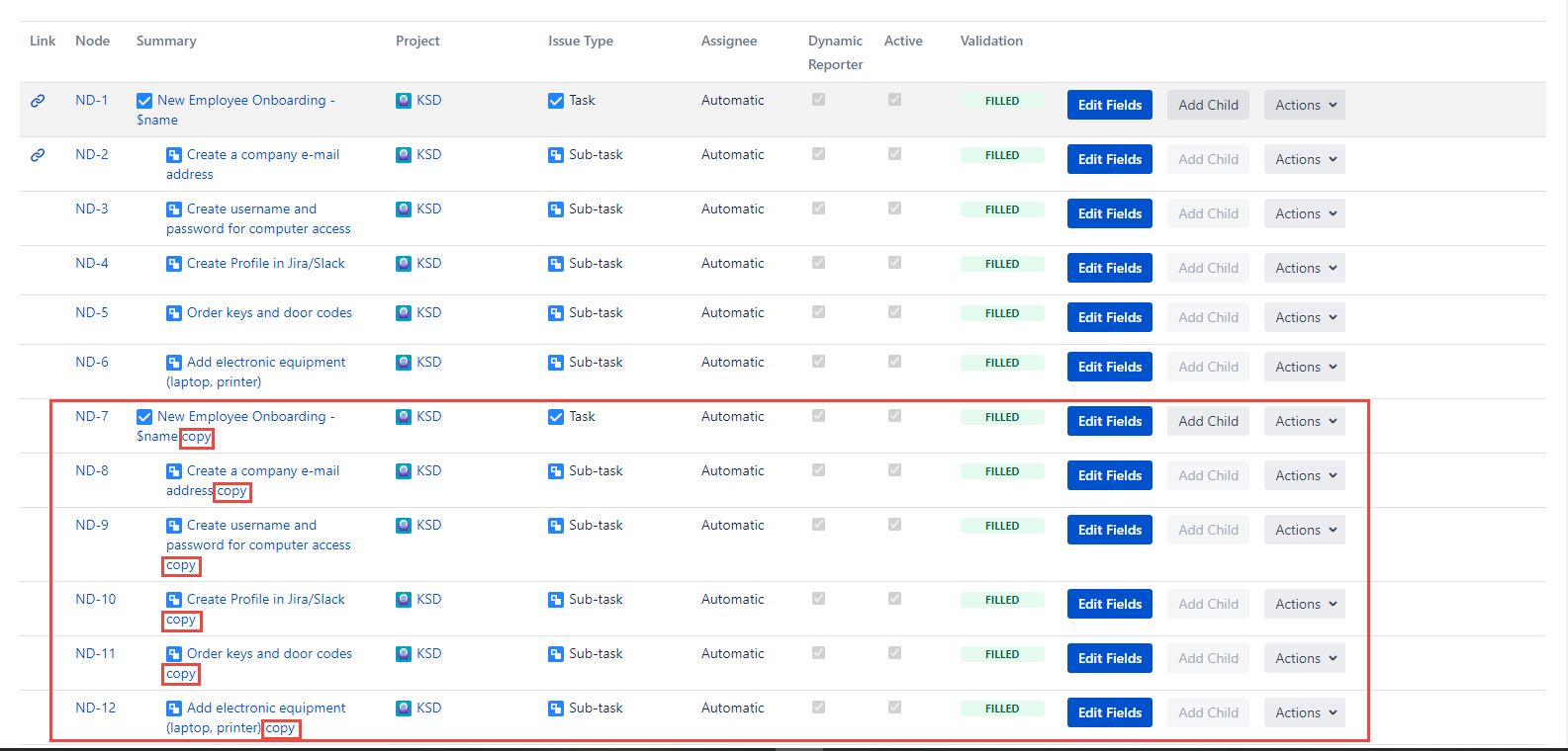 Node copying allows to quickly create repetitive or similar set of issues within one Hierarchy.