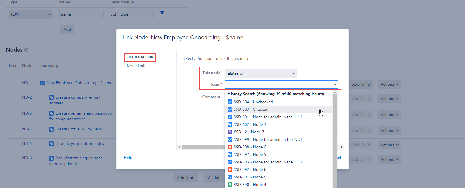 Notice that one node can be linked to multiple Issues/Nodes, we just need to add more to the selection field.