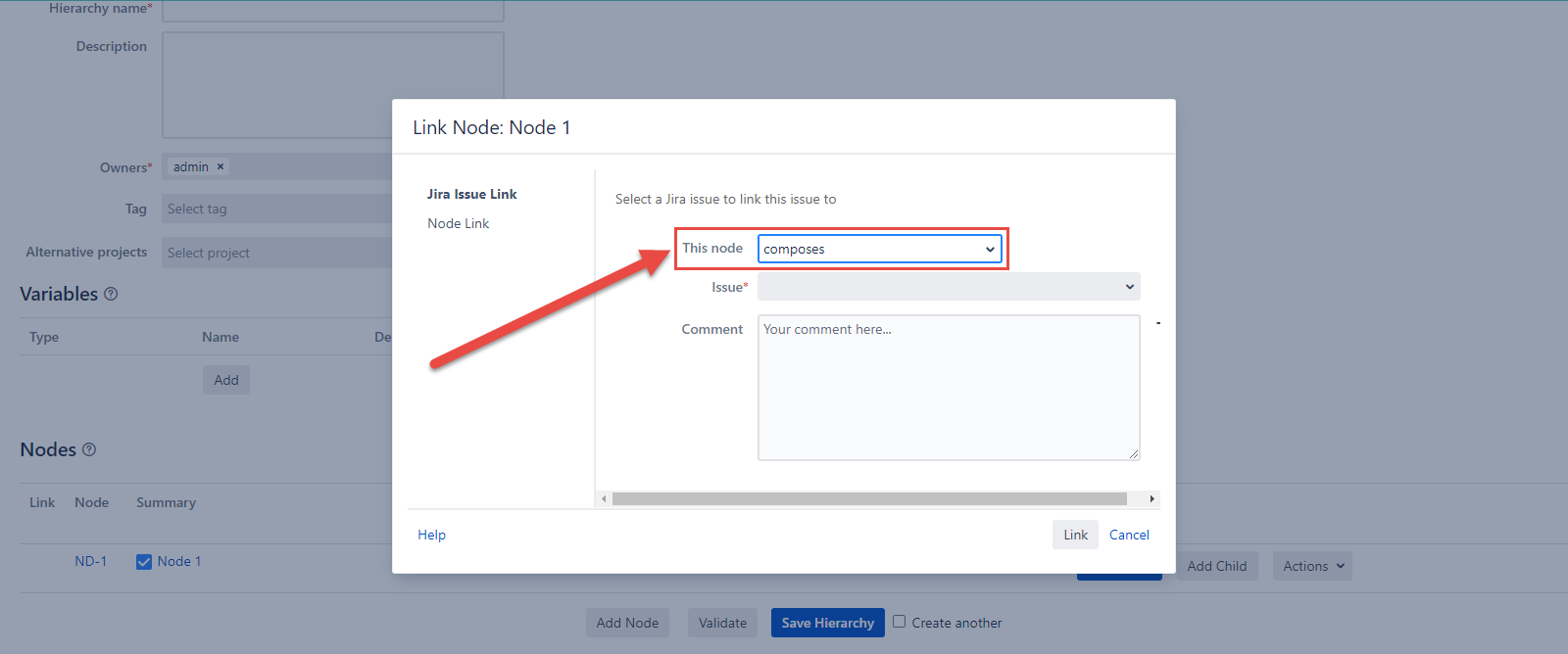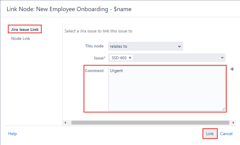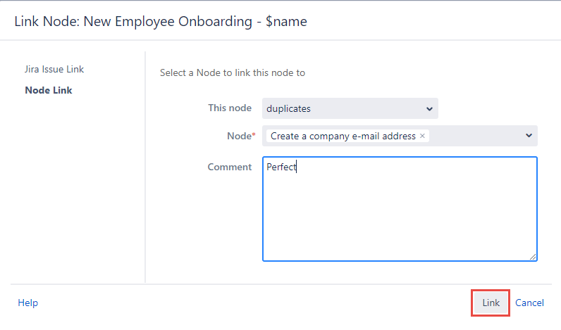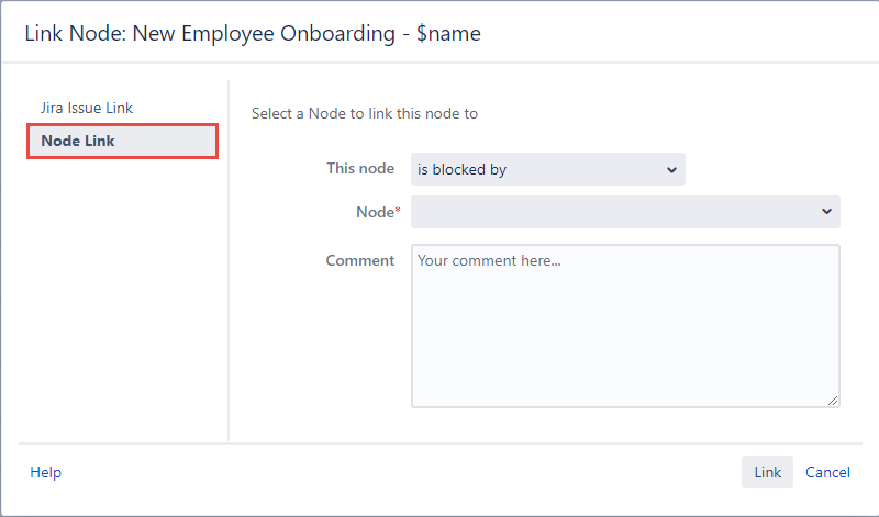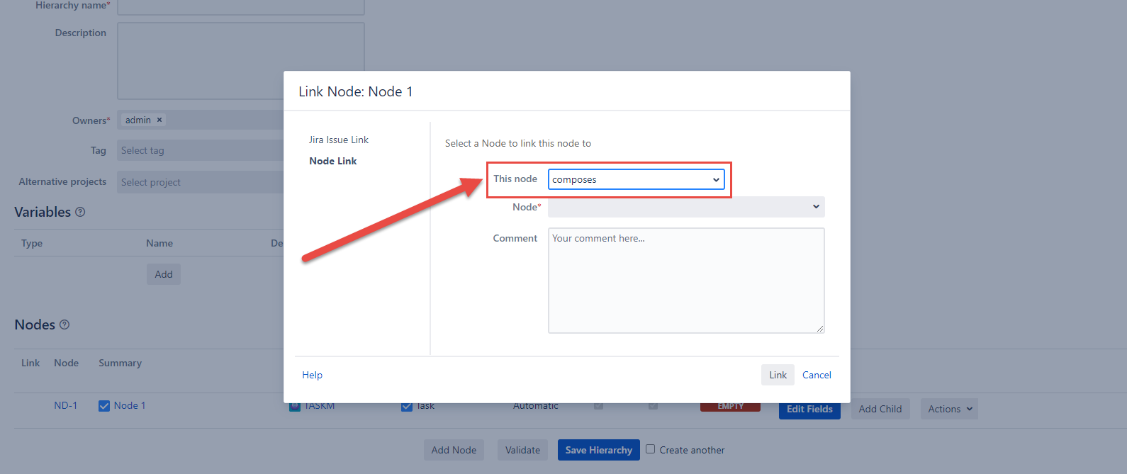 Write a comment in the optional Comment field and click the Link button at the footer of the Link Node dialog.