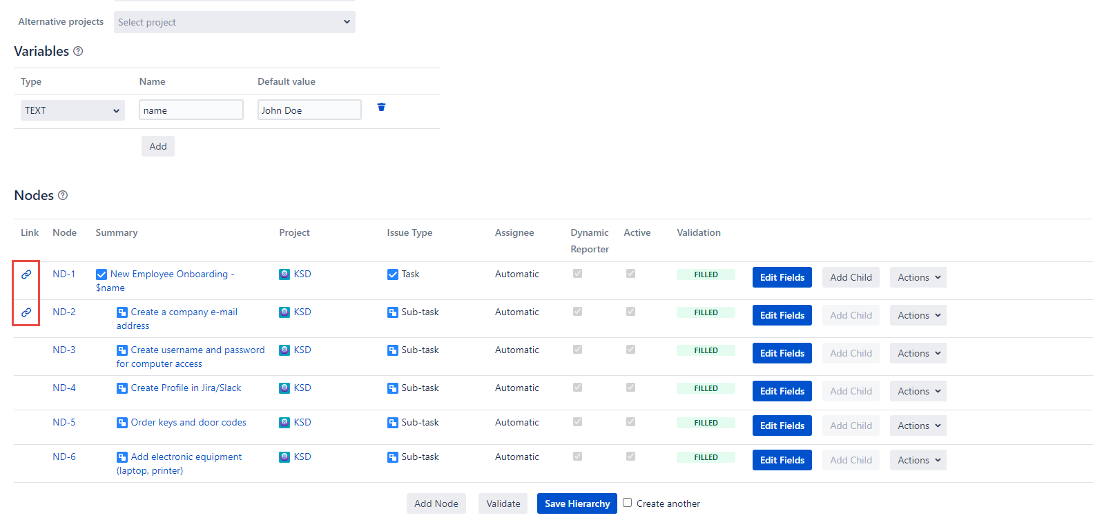 After clicking the Link button the Link Node dialog will be closed and the link image will be displayed in the Link column of the Nodes section on the Create Hierarchy page.