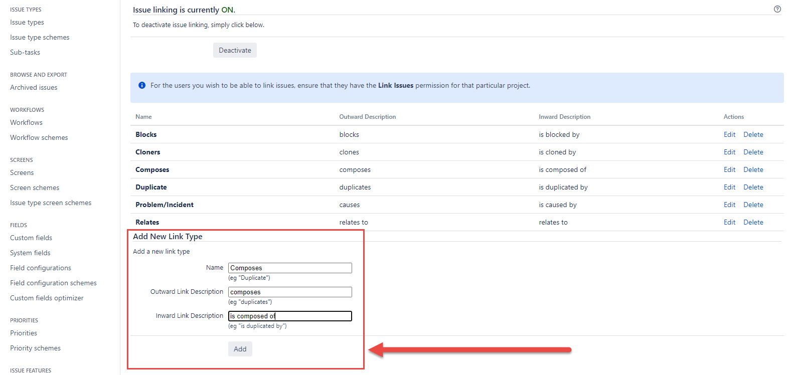 Enter the values in the Add New Link Type fields and click the Add button