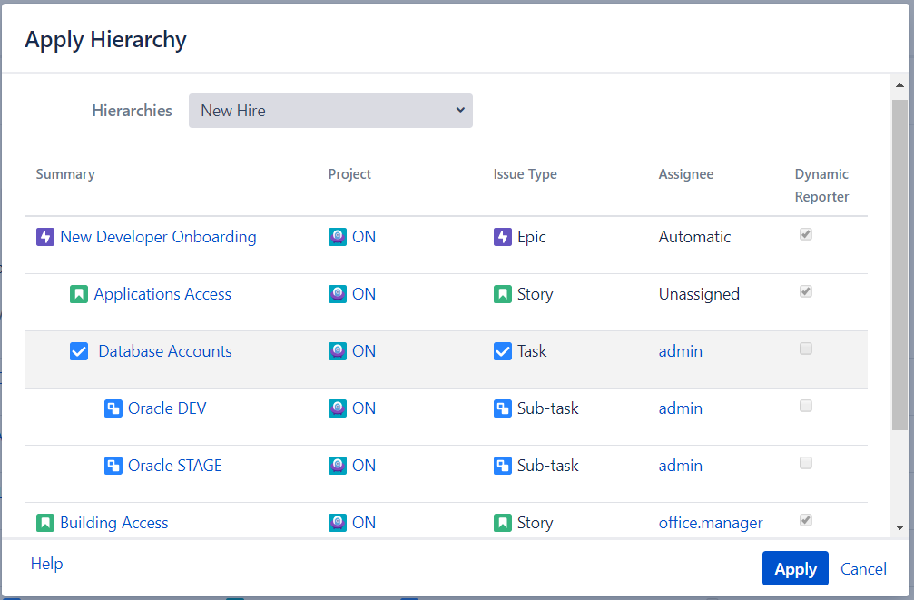 In order to create all the issues defined in the Hierarchy, go to the Templates → Apply Hierarchy in the top navigation menu.