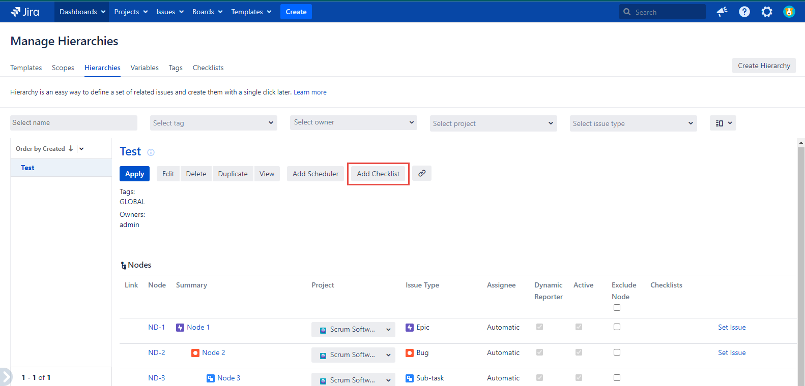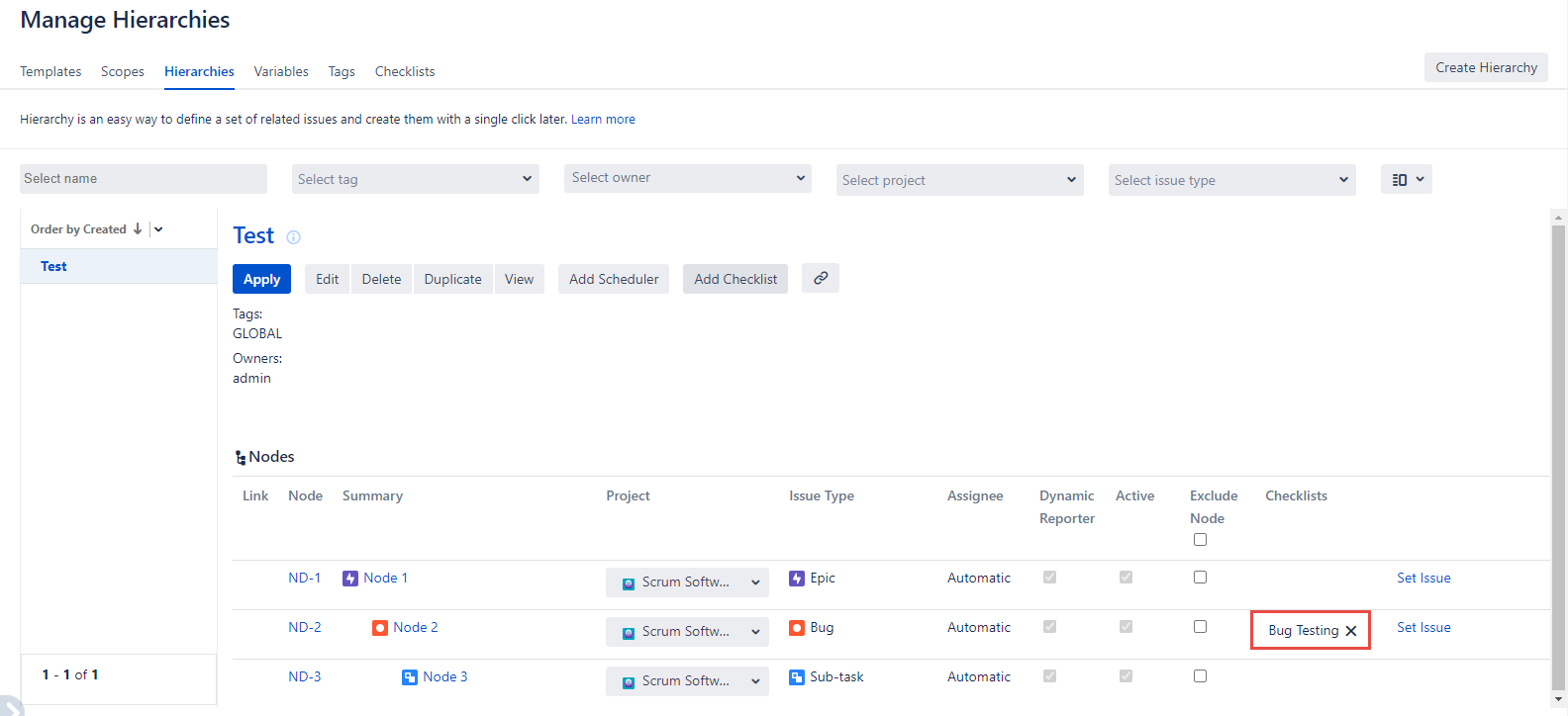 Select the data in the fields and click the ‘Add’ button. You’ll see the Checklist name added to the selected issue type and displayed in the ‘Checklists’ column on the ‘Manage Hierarchies’ page. The checklists added to the specific nodes are also visible on the ‘Apply Hierarchy’ dialog and on the hierarchy view page.