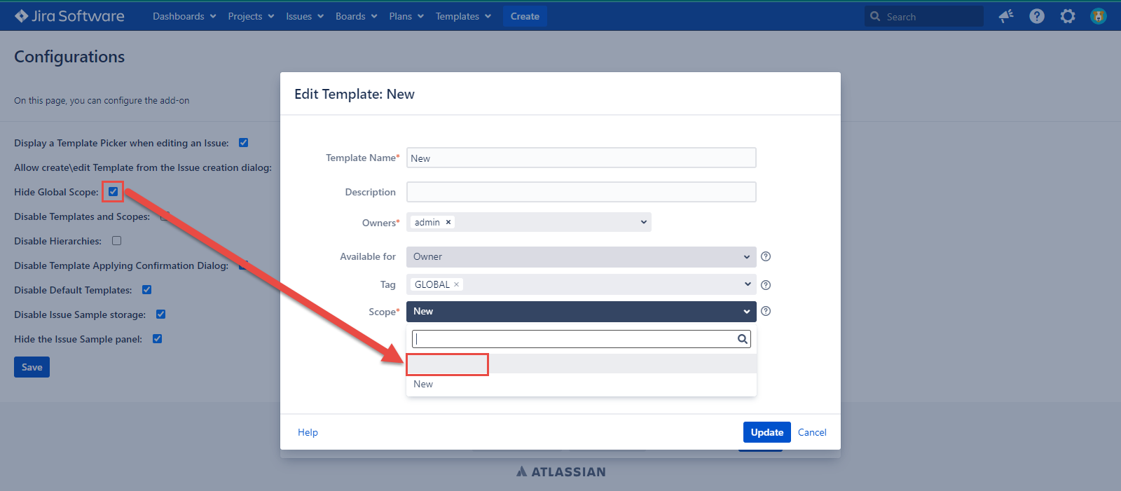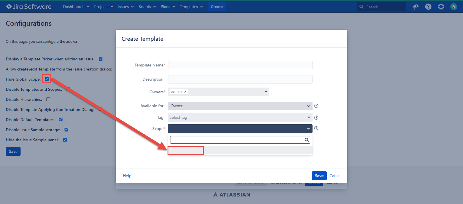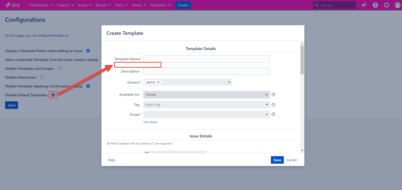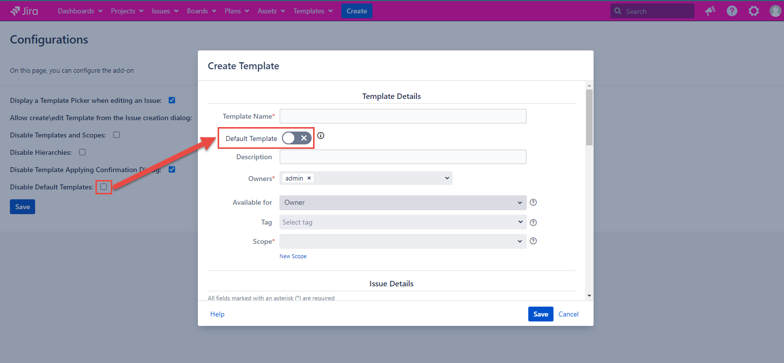 Template and Scope are absent on the Templates tab and in the issue dialogs if the configuration is checked. If the configuration is unmarked, the Template and Scope work as usual.