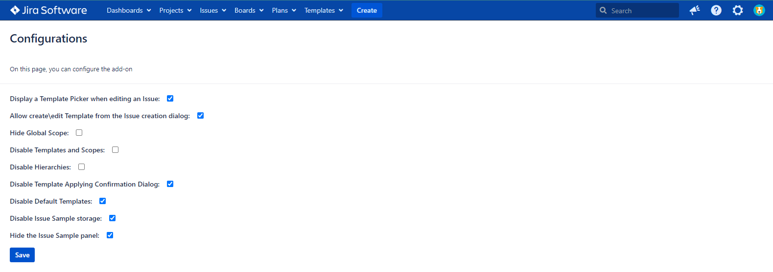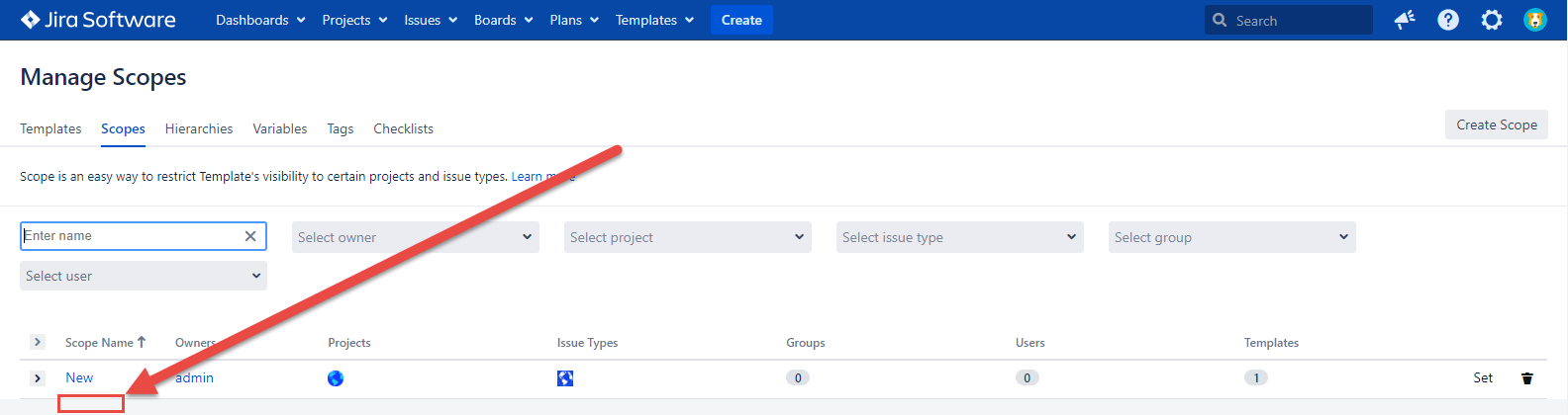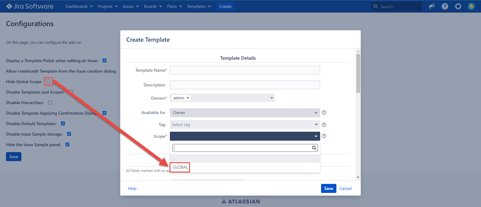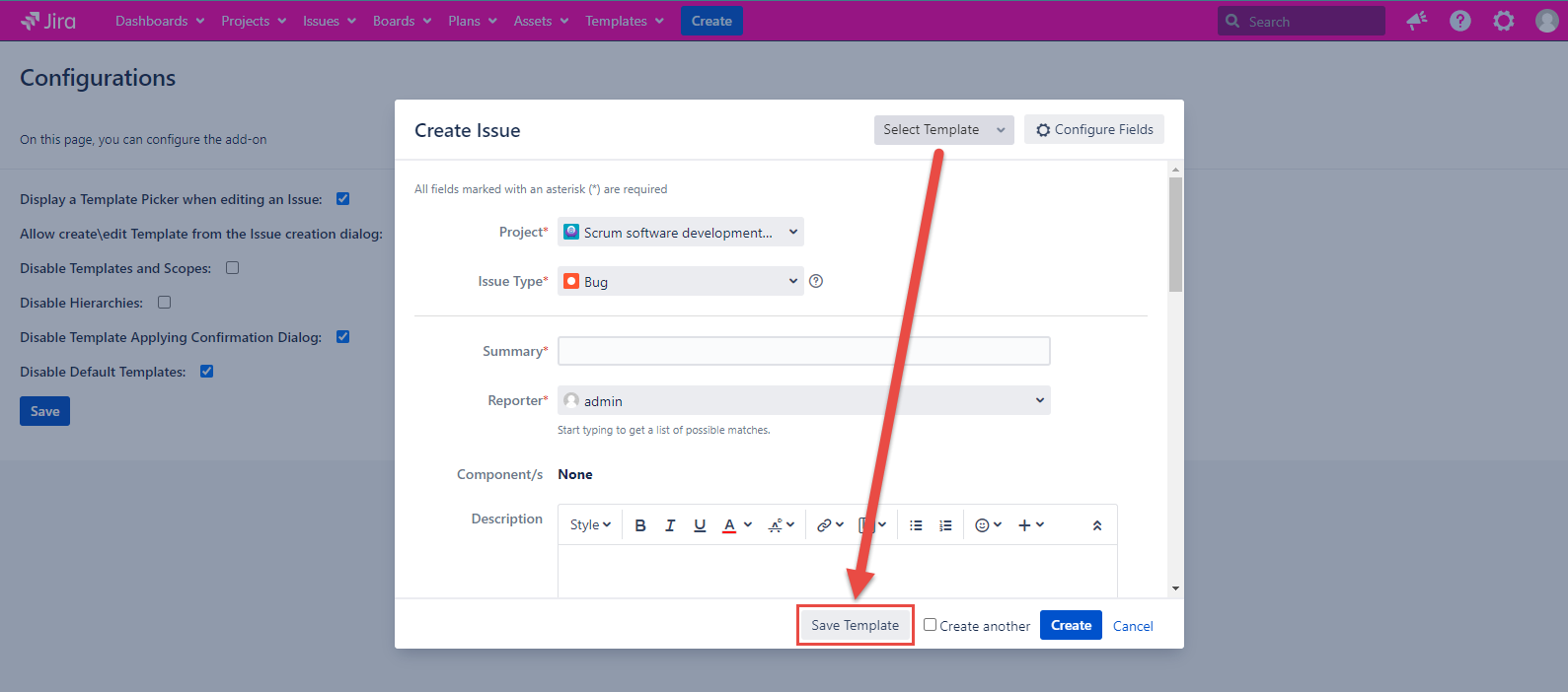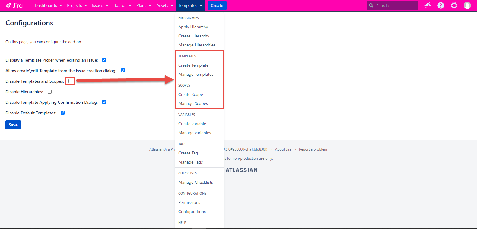 Template and Scope are absent on the Templates tab and in the issue dialogs if the configuration is checked. If the configuration is unmarked, the Template and Scope work as usual.