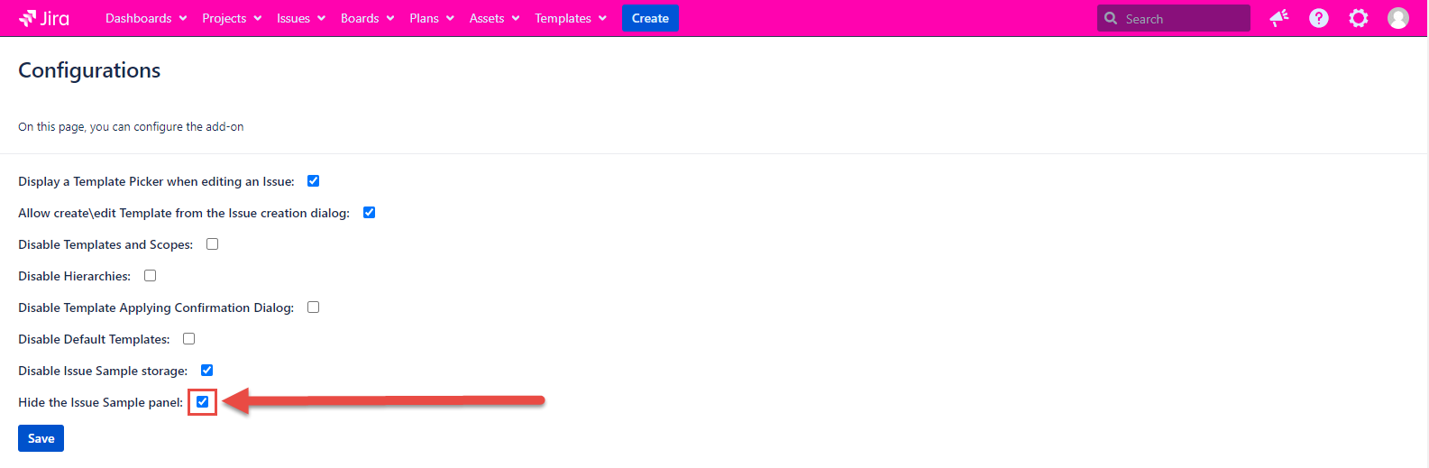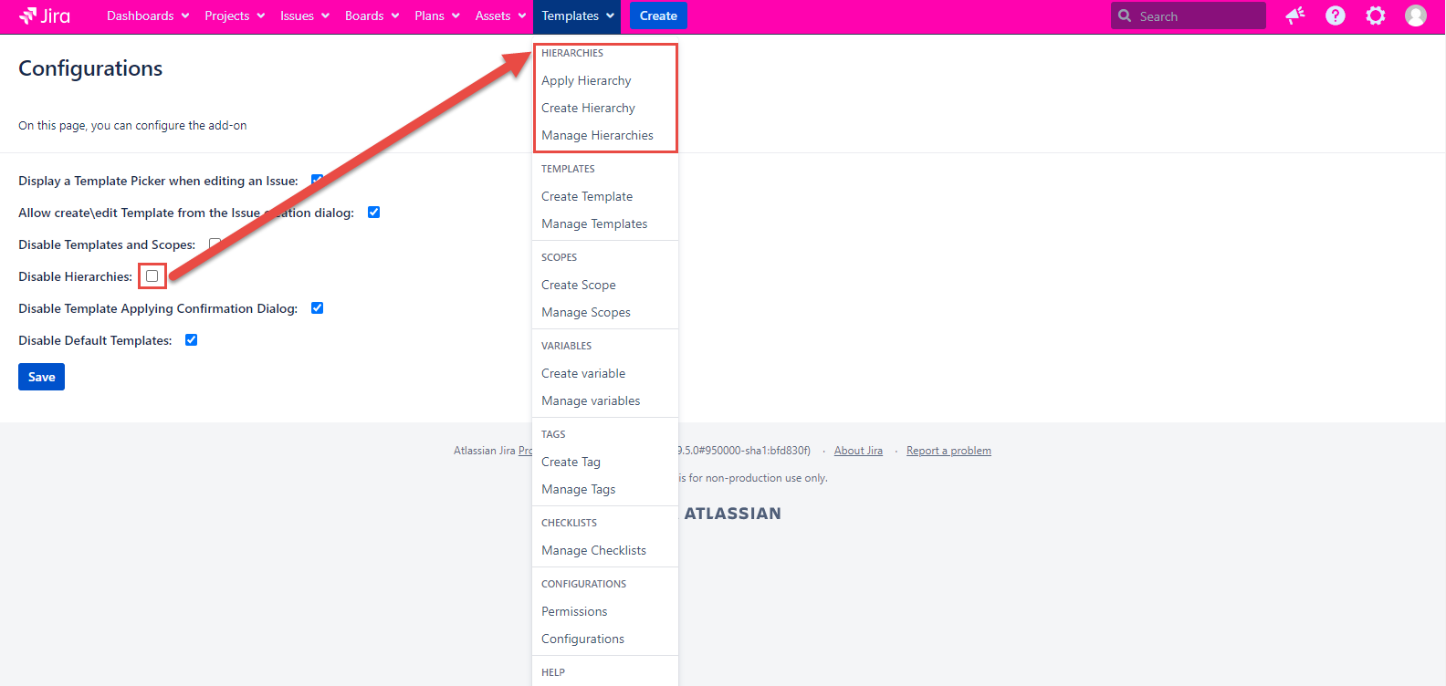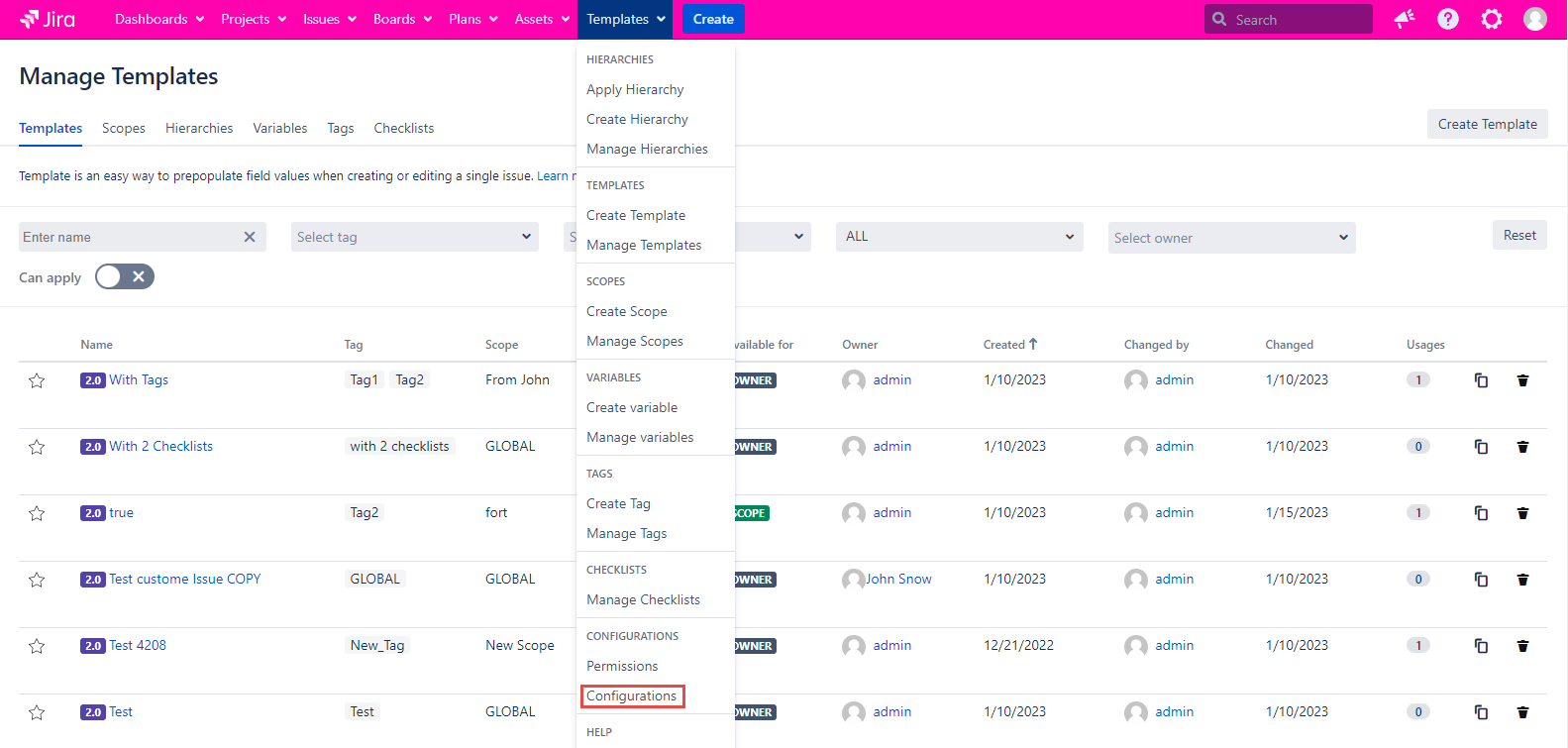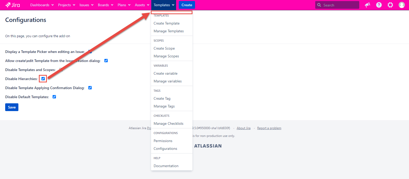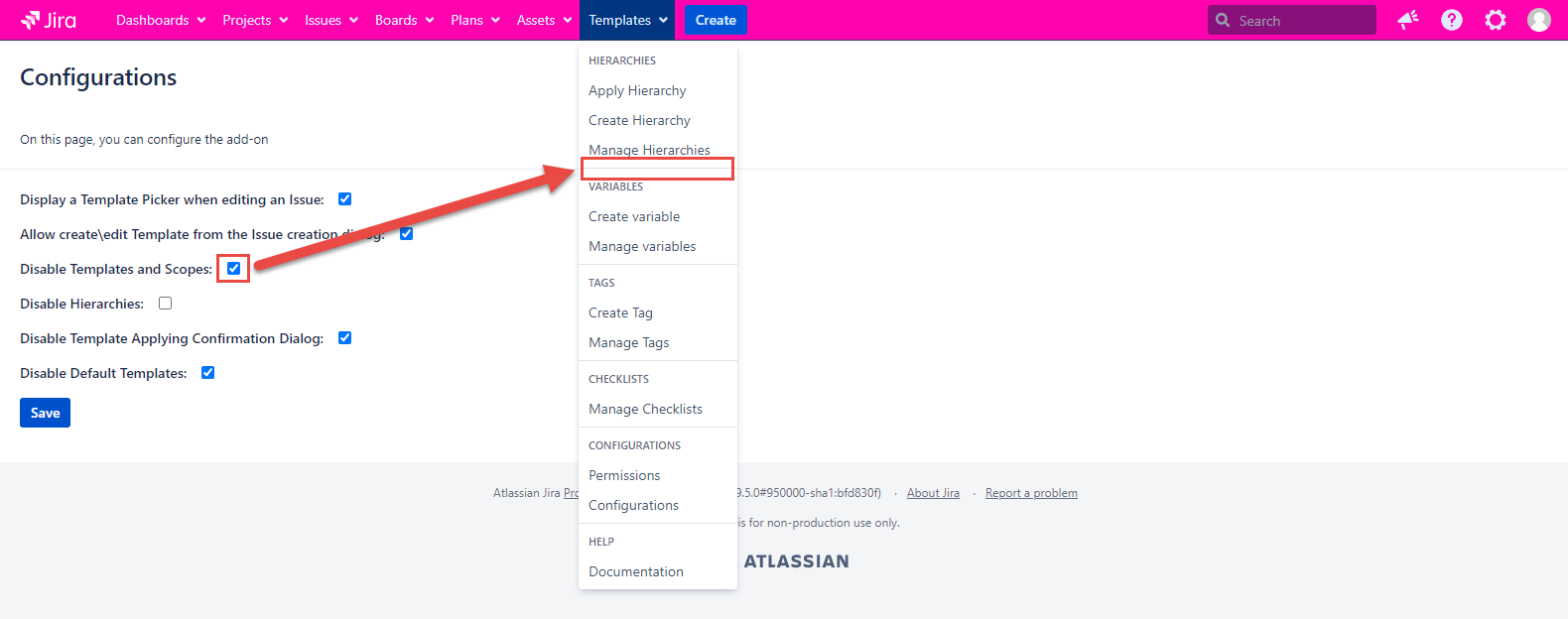 Template and Scope are absent on the Templates tab and in the issue dialogs if the configuration is checked. If the configuration is unmarked, the Template and Scope work as usual.