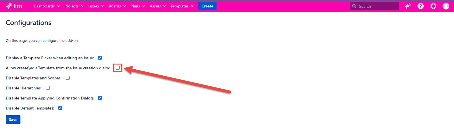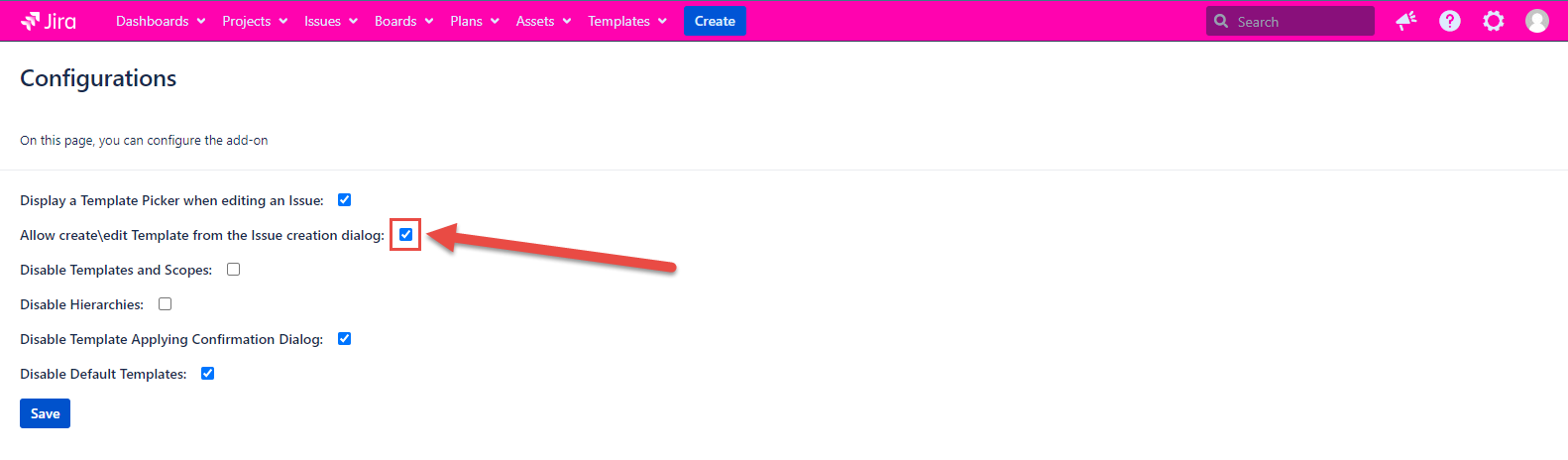 If the configuration is marked, then it's possible to edit/create a Template in Create Issue Dialog. If the configuration is unmarked, then the possibility of the creation/edition Template is no longer available on Create Issue Dialog.