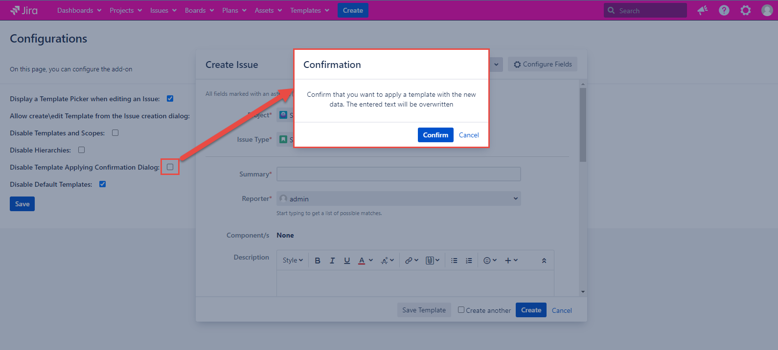 Confirmation dialog is not opened above the Create Issue dialog after selecting the template in the Select Template list if the configuration is marked. If the configuration is unmarked, the Confirmation dialog shows as usual.