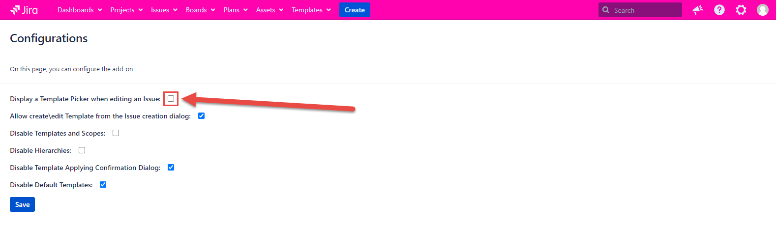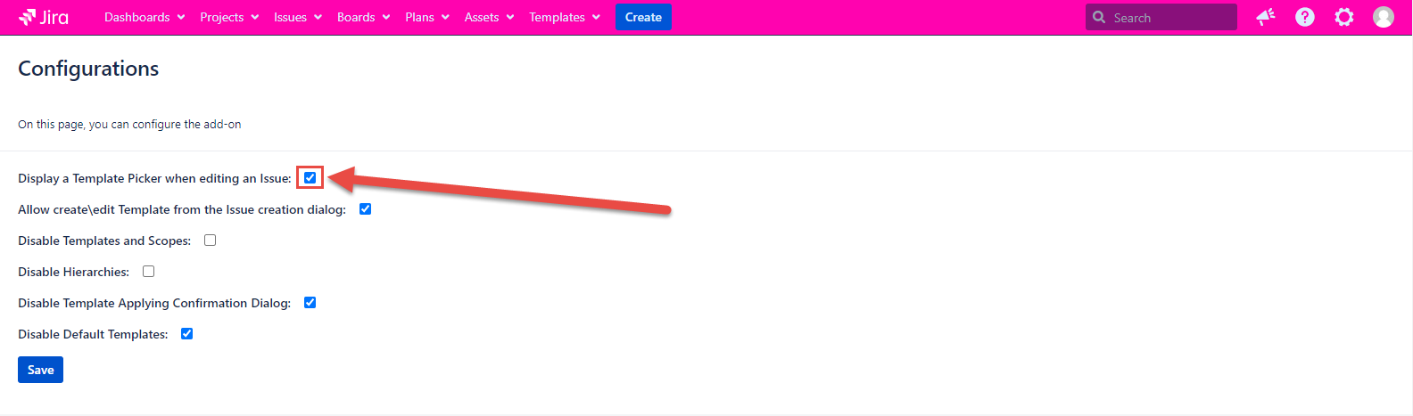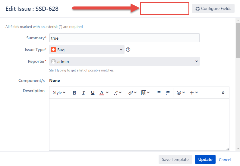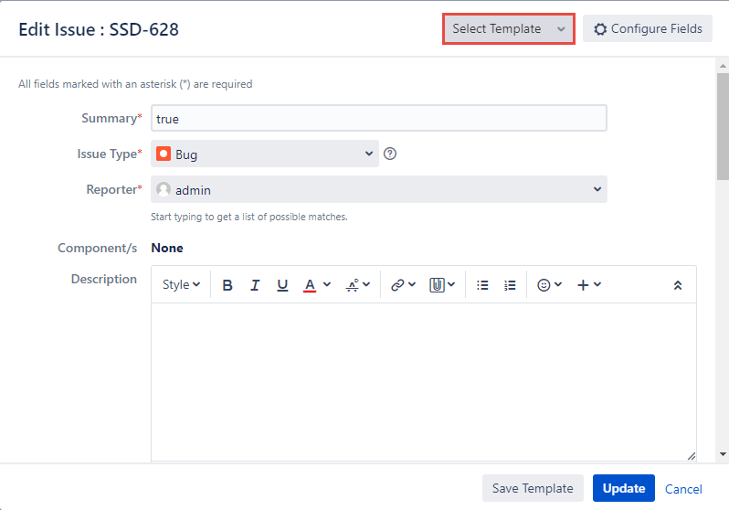 If the configuration is marked, the Template picker appears in Edit Issue Dialog as usual. If the configuration is unmarked, the Template picker is no longer displayed in Edit Issue Dialog.