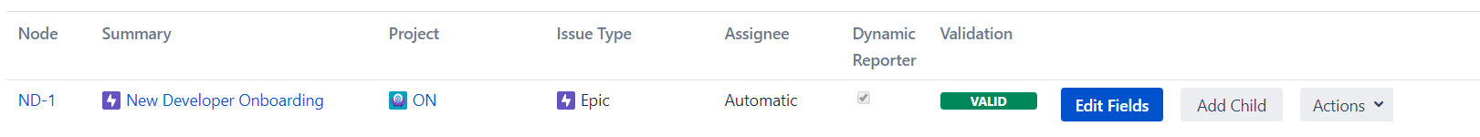 Add Child | Add a Node under the current Node. If current Node is of type Epic, the Child Node becomes either included in the Epic (for Nodes with standard issue types) or becomes a Sub-task (for Nodes with sub-task issue types) |