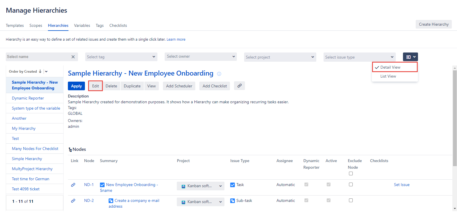 To enter the Edit Hierarchy page from the Detailed View you have to click the Edit button below the specific Hierarchy name.