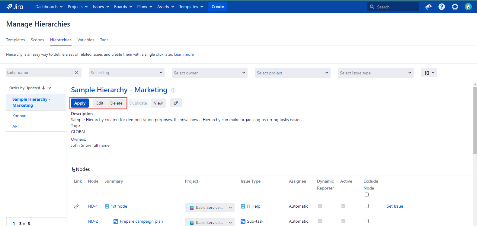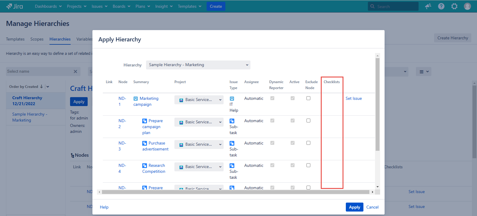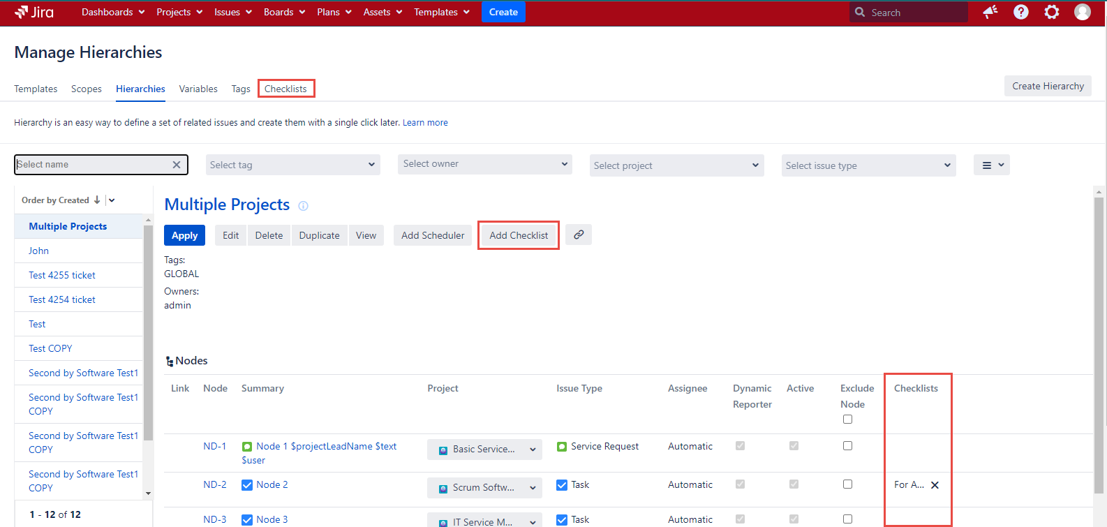 The checklists that are available for the current user by the Available for field value on the Create Checklist dialog are displayed on the Issue view page after the hierarchy apply.