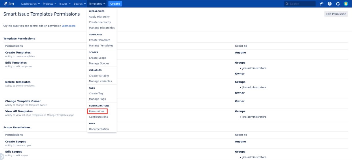 To simplify the Smart Issue Templates app management the members of the jira-administrators group are granted the main permissions by default. In case they are not granted the specific Smart Issue Templates permissions, admins are able to execute some actions.