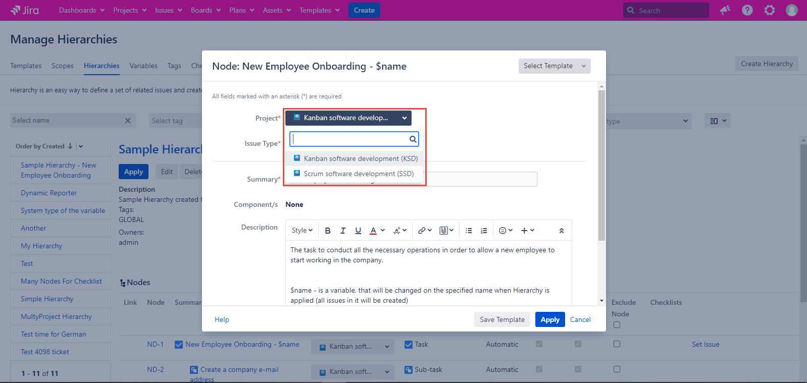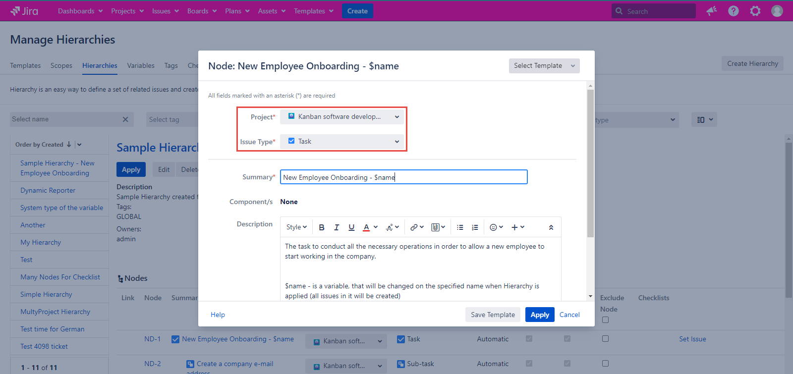 For different Jira Issue Types this feature works slightly differently. For instance, if you only choose a node that has children, then the changes you apply to the parent will also take effect on the children. So, if you choose the Task issue type of an issue, then all the sub-tasks it contains will also be applied to the project you chose for that Task.