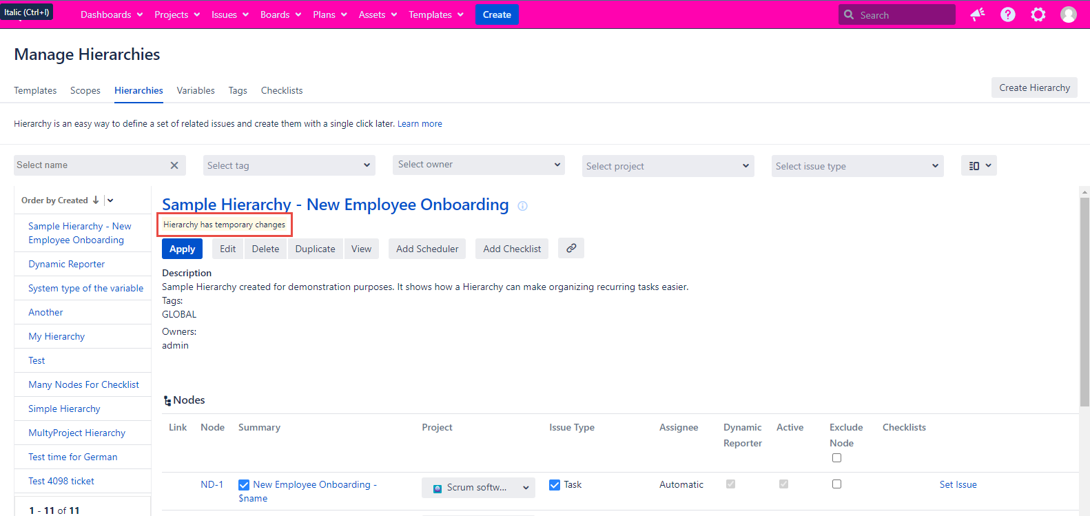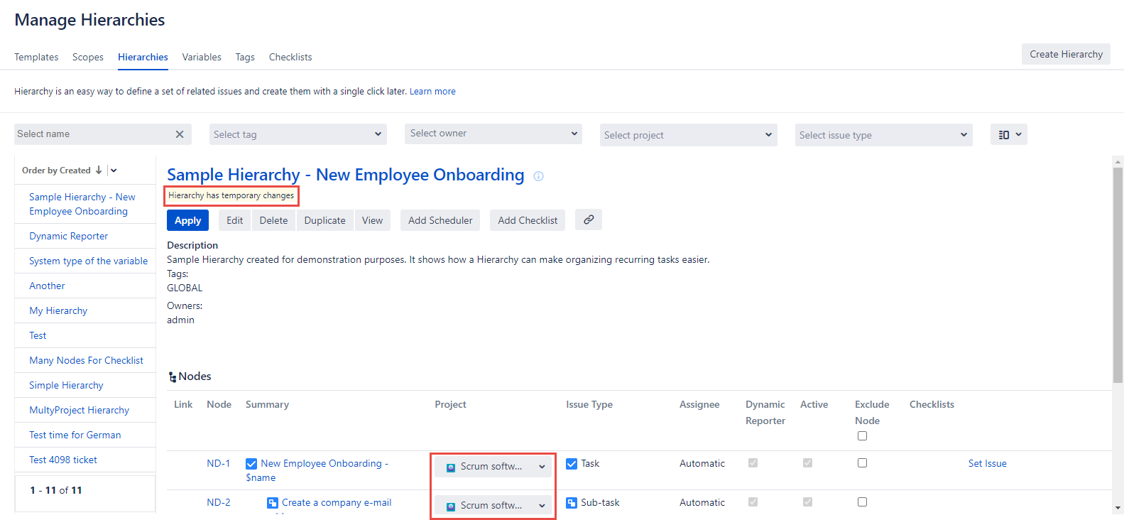 Last but not least, all of the above works in the ‘Temporary changes’ mode, which means that all of the changes you make are not applied to the Hierarchy you chose as a playground. As soon as you click the 'Apply' button new issues get created and the Hierarchy you chose comes back to the original state.