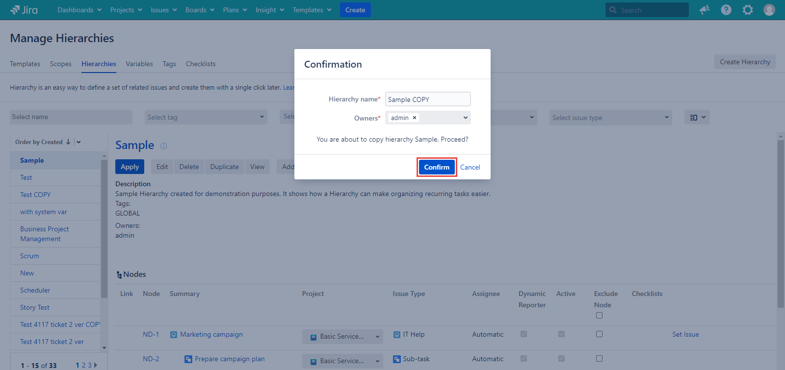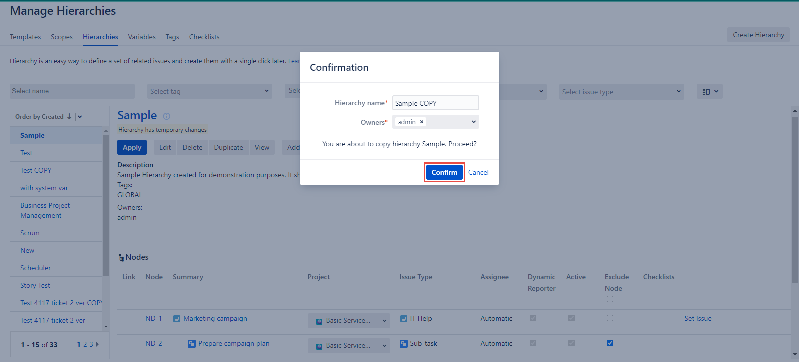 You are able to rename it, select another owner for this duplicated hierarchy on the ‘Confirmation’ dialog. Then click the ‘Confirm’ button.