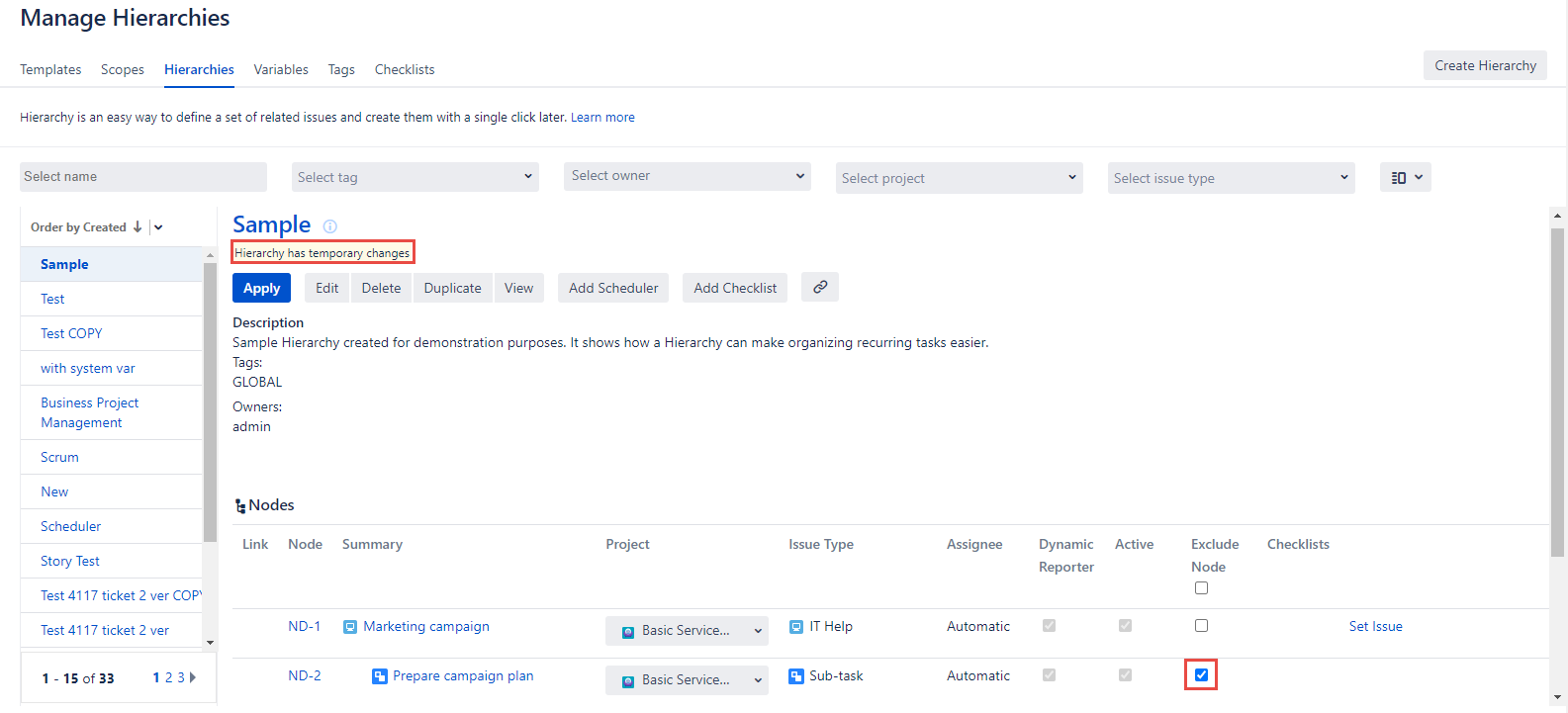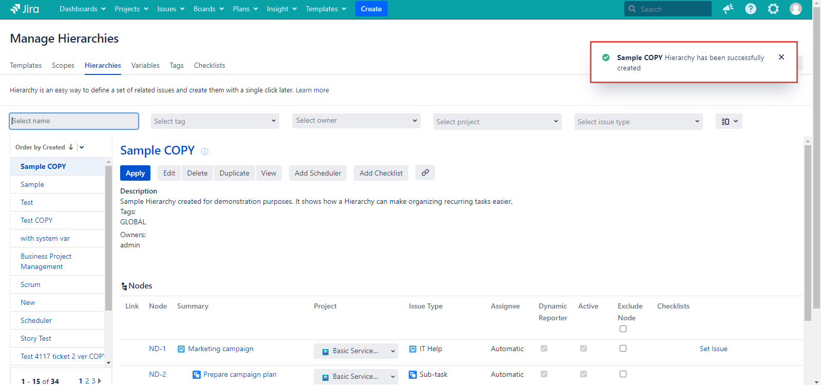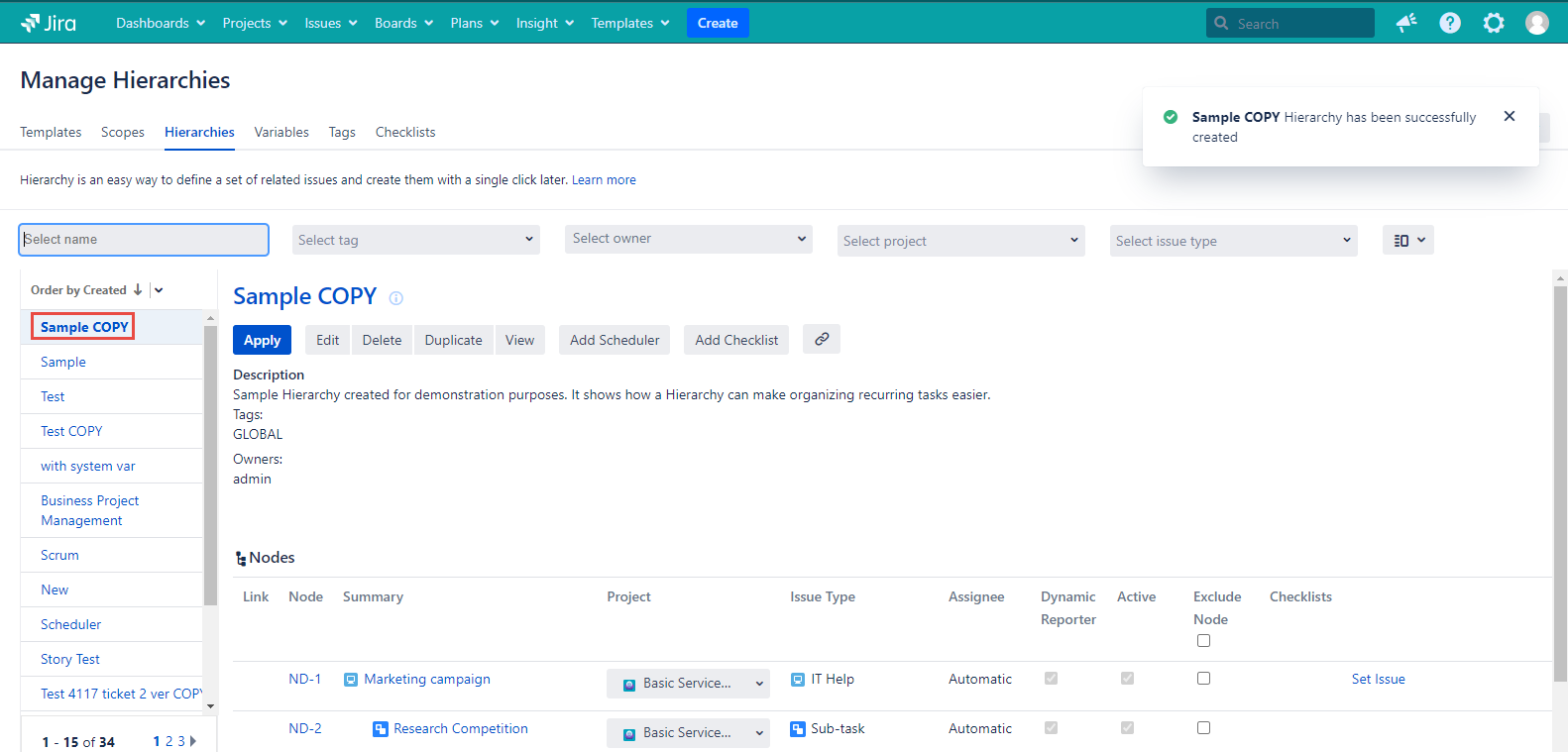 Note that Schedulers and the Checklists of the specific hierarchy will not be copied by clicking the ‘Duplicate’ button.