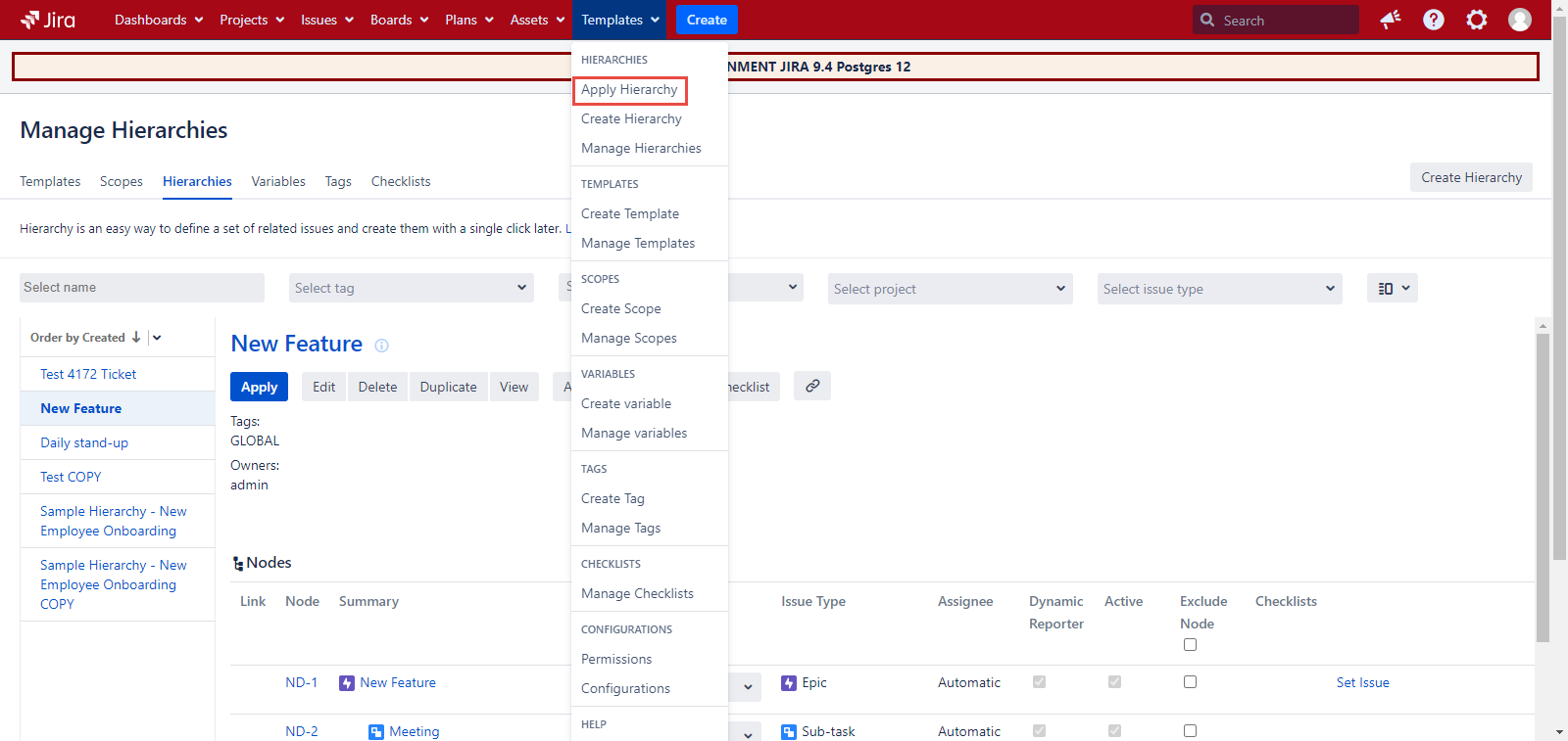 This feature will let our users update the existing issues with new child issues using the Hierarchies. To implement it you should simply go to the ‘Apply Hierarchy' dialog of the 'Templates’ menu.