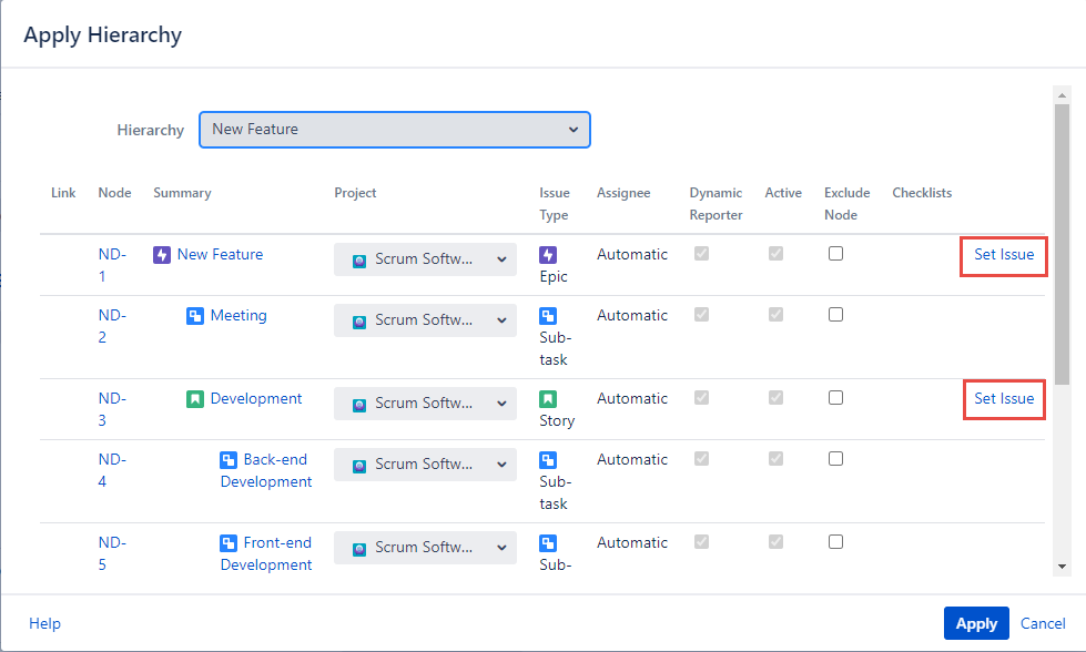In the opened up ‘Apply Hierarchy’ dialog, select a Hierarchy you want to use and click the ‘Set Issue' button of the specific node.