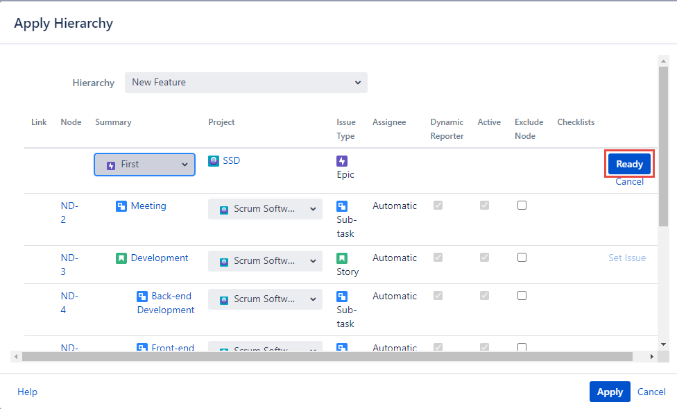 Choose the issue you want to link the children issues to and click the ‘Ready’ button to the right in the following node row.