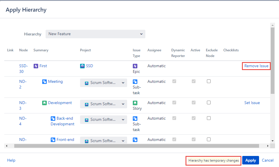 As the ‘Set Issue’ function is temporary you’ll be able to see the ‘Hierarchy has temporary changes’ notification placed at the footer of the ‘Apply Hierarchy’ dialog.