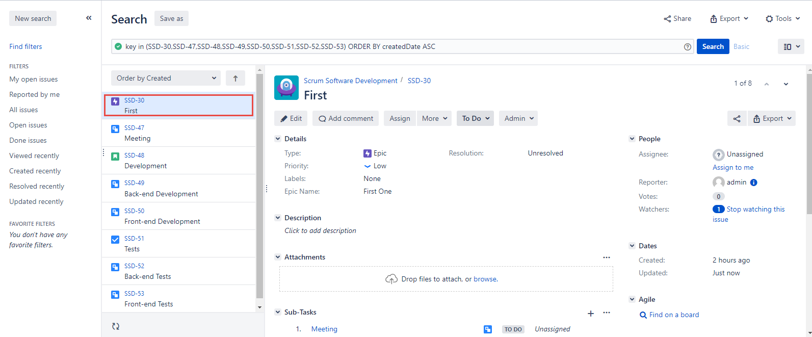 You’ll see the created issues on the next page as shown on the screenshot below. The setted Epic contains the child issues linked to it. The Epic is not created with the following actions but is displayed to make the applying process more clear.