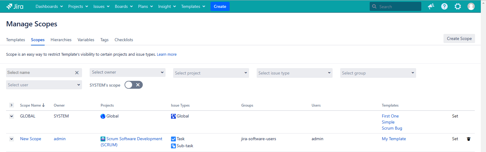 Go to Templates → Manage Scopes