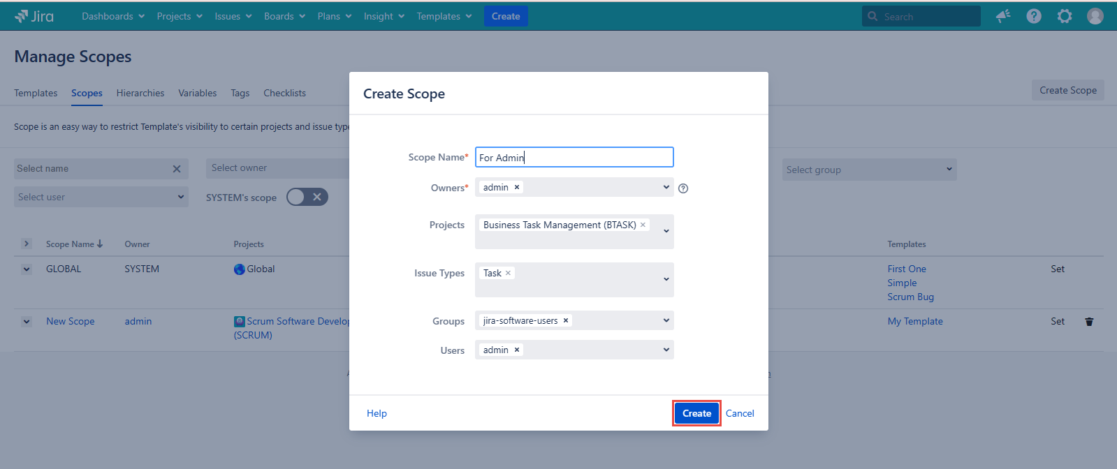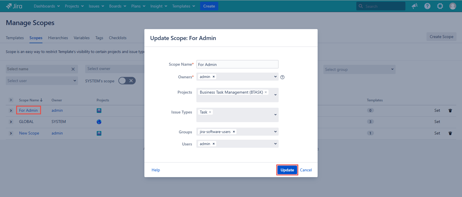 Go to Templates → Manage Scopes. Click the Scope name, that you need to edit, for example, ‘For Admin’.