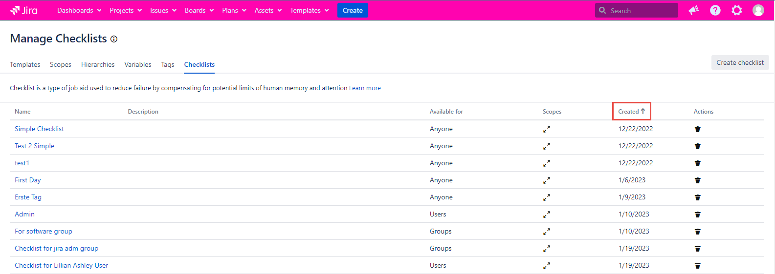 Click the ‘Created’ column name once more and the checklists will be sorted from earlier to older created.