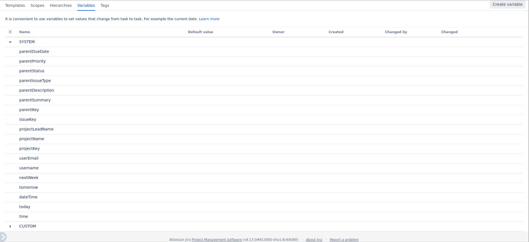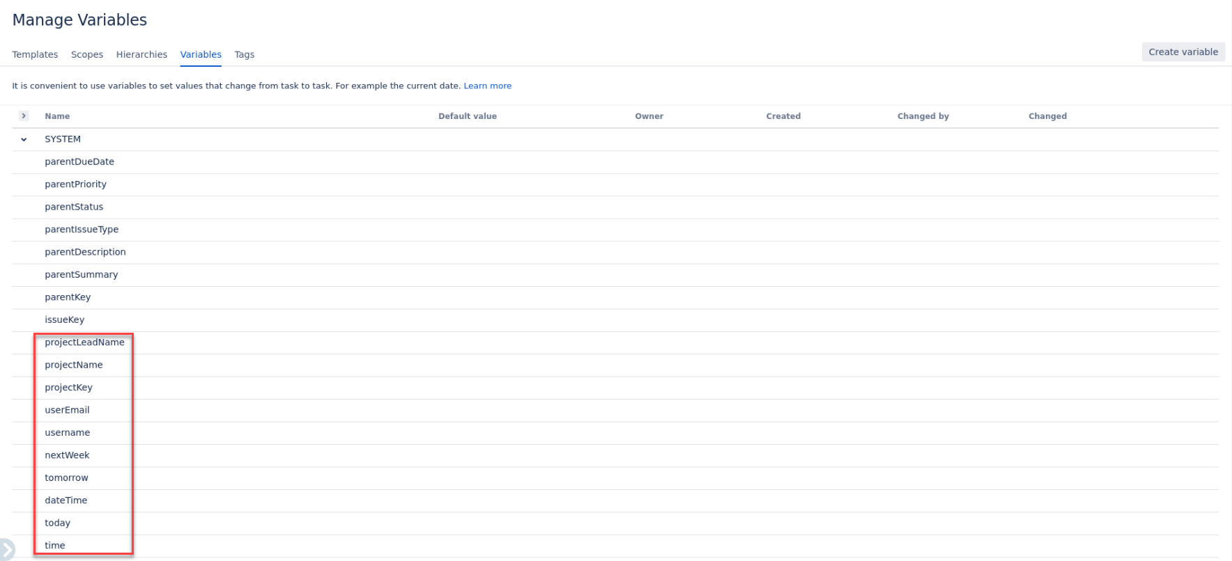 The SYSTEM variables for templates are: time, today, dateTime, tomorrow, nextWeek, username, userEmail, projectKey, projectName.
