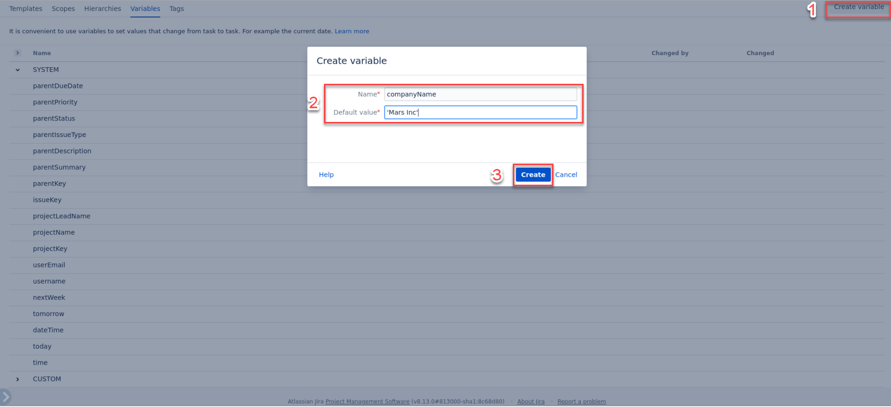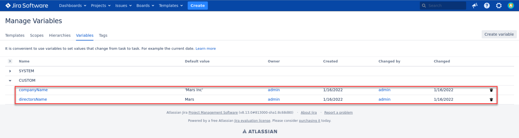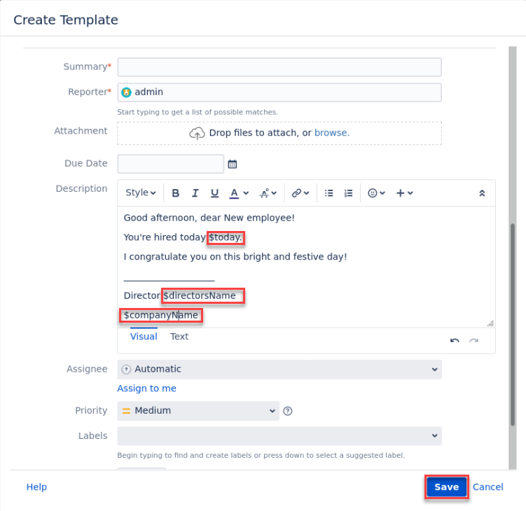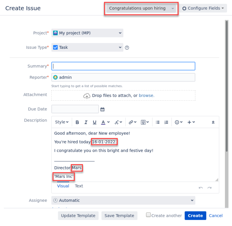 Those template fields that have been filled in will be automatically copied to the corresponding issue fields. Variable names will be replaced with values: